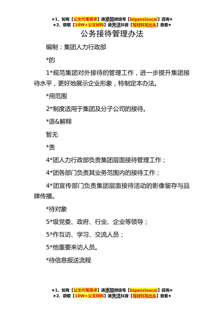 ★1、如有【公文代笔需求】请添加微信号【biganzisucai】咨询★★2、获取【10W+公文材料】请关注抖音【写材料写出头】查看★★1、如有【公文代笔需求】请添加微信号【biganzisucai】咨询★★2、获取【10W+公文材料】请关注抖音【写材料写出头】查看★★1、如有【公文代笔需求】请添加微信号【biganzisucai】咨询★★2、获取【10W+公文材料】请关注抖音【写材料写出头】查看★公务接待管理办法编制:集团人力行政部*的1*规范集团对外接待的管理工作,进一步提升集团接待水平,更好地展示企业形象,特制定本办法。*用范围2*制度适用于集团及分子公司的接待。*语&解释暂无*责4*团人力行政部负责集团层面接待管理工作;4*团各部门负责其业务范围内的接待工作;4*团宣传部门负责集团层面接待活动的影像留存与品牌传播。...
