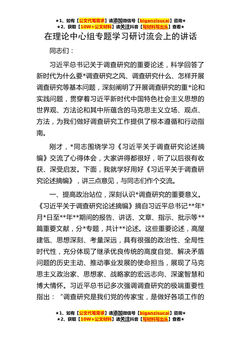 ★1、如有【公文代笔需求】请添加微信号【biganzisucai】咨询★★2、获取【10W+公文材料】请关注抖音【写材料写出头】查看★★1、如有【公文代笔需求】请添加微信号【biganzisucai】咨询★★2、获取【10W+公文材料】请关注抖音【写材料写出头】查看★★1、如有【公文代笔需求】请添加微信号【biganzisucai】咨询★★2、获取【10W+公文材料】请关注抖音【写材料写出头】查看★在理论中心组专题学习研讨流会上的讲话同志们:习近平总书记关于调查研究的重要论述,科学回答了新时代为什么要*调查研究之风、调查研究什么、怎样开展调查研究等基本问题,深刻阐明了开展调查研究的重*论和实践问题,贯穿着习近平新时代中国特色社会主义思想的世界观、方法论和其中所蕴含的马克思主义立场、观点、方法,为我们做好调查研...