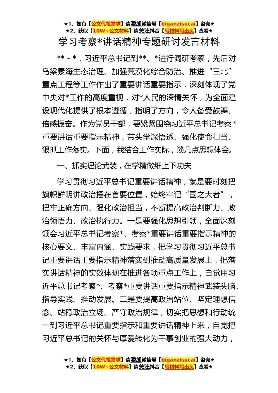 ★1、如有【公文代笔需求】请添加微信号【biganzisucai】咨询★★2、获取【10W+公文材料】请关注抖音【写材料写出头】查看★★1、如有【公文代笔需求】请添加微信号【biganzisucai】咨询★★2、获取【10W+公文材料】请关注抖音【写材料写出头】查看★★1、如有【公文代笔需求】请添加微信号【biganzisucai】咨询★★2、获取【10W+公文材料】请关注抖音【写材料写出头】查看★学习考察*讲话精神专题研讨发言材料**-*,习近平总书记到**、*进行调研考察,先后对乌梁素海生态治理、加强荒漠化综合防治、推进“三北”重点工程等工作作出了重要讲话重要指示,深刻体现了党中央对*工作的高度重视,对*人民的深情关怀,为全面建设现代化提供了根本遵循,指明了方向,令人备受鼓舞、倍感振奋。作为党员干部,要紧紧围绕习...