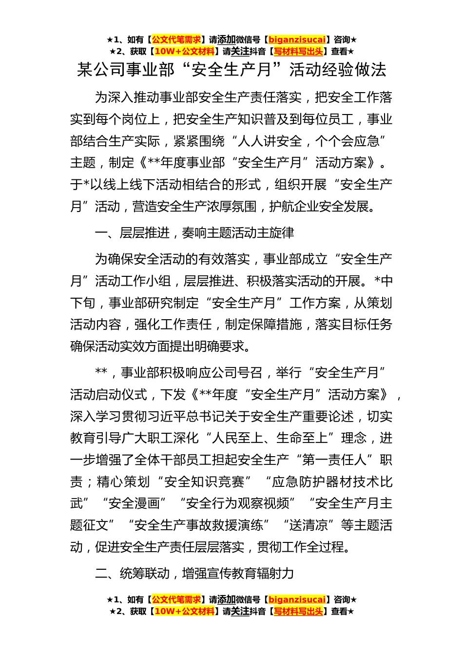 ★1、如有【公文代笔需求】请添加微信号【biganzisucai】咨询★★2、获取【10W+公文材料】请关注抖音【写材料写出头】查看★★1、如有【公文代笔需求】请添加微信号【biganzisucai】咨询★★2、获取【10W+公文材料】请关注抖音【写材料写出头】查看★★1、如有【公文代笔需求】请添加微信号【biganzisucai】咨询★★2、获取【10W+公文材料】请关注抖音【写材料写出头】查看★某公司事业部“安全生产月”活动经验做法为深入推动事业部安全生产责任落实,把安全工作落实到每个岗位上,把安全生产知识普及到每位员工,事业部结合生产实际,紧紧围绕“人人讲安全,个个会应急”主题,制定《**年度事业部“安全生产月”活动方案》。于*以线上线下活动相结合的形式,组织开展“安全生产月”活动,营造安全生产浓厚氛围,...
