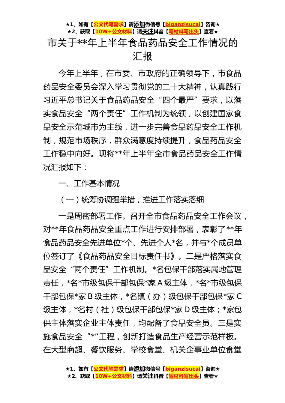 ★1、如有【公文代笔需求】请添加微信号【biganzisucai】咨询★★2、获取【10W+公文材料】请关注抖音【写材料写出头】查看★★1、如有【公文代笔需求】请添加微信号【biganzisucai】咨询★★2、获取【10W+公文材料】请关注抖音【写材料写出头】查看★★1、如有【公文代笔需求】请添加微信号【biganzisucai】咨询★★2、获取【10W+公文材料】请关注抖音【写材料写出头】查看★市关于**年上半年食品药品安全工作情况的汇报今年上半年,在市委、市政府的正确领导下,市食品药品安全委员会深入学习贯彻党的二十大精神,认真践行习近平总书记关于食品药品安全“四个最严”要求,以落实食品安全“两个责任”工作机制为统领,以创建国家食品安全示范城市为主线,进一步完善食品药品安全工作机制,规范市场秩序,群众满意...