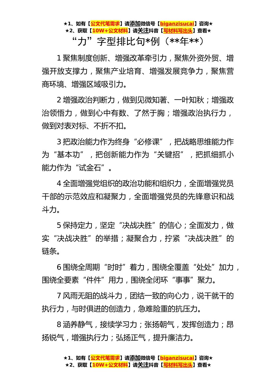 ★1、如有【公文代笔需求】请添加微信号【biganzisucai】咨询★★2、获取【10W+公文材料】请关注抖音【写材料写出头】查看★★1、如有【公文代笔需求】请添加微信号【biganzisucai】咨询★★2、获取【10W+公文材料】请关注抖音【写材料写出头】查看★★1、如有【公文代笔需求】请添加微信号【biganzisucai】咨询★★2、获取【10W+公文材料】请关注抖音【写材料写出头】查看★“力”字型排比句*例(**年**)1聚焦制度创新、增强改革牵引力,聚焦外资外贸、增强开放支撑力,聚焦产业培育、增强发展竞争力,聚焦营商环境、增强区域吸引力。2增强政治判断力,做到见微知著、一叶知秋;增强政治领悟力,做到心中有数、了然于胸;增强政治执行力,做到对表对标、不折不扣。3把政治能力作为终身“必修课”,把战略思维能...
