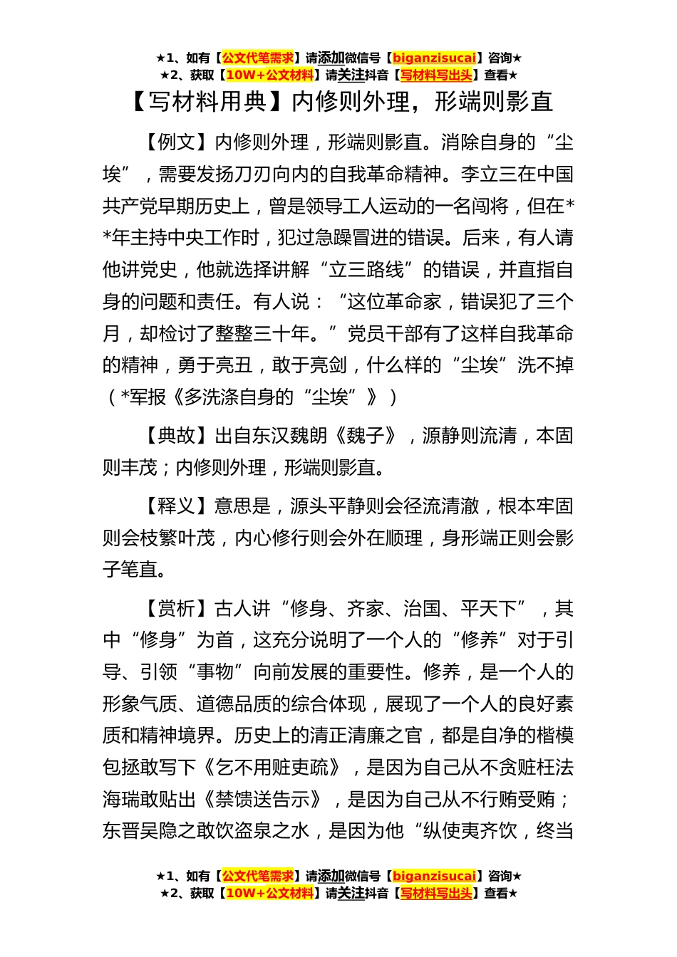 ★1、如有【公文代笔需求】请添加微信号【biganzisucai】咨询★★2、获取【10W+公文材料】请关注抖音【写材料写出头】查看★★1、如有【公文代笔需求】请添加微信号【biganzisucai】咨询★★2、获取【10W+公文材料】请关注抖音【写材料写出头】查看★★1、如有【公文代笔需求】请添加微信号【biganzisucai】咨询★★2、获取【10W+公文材料】请关注抖音【写材料写出头】查看★【写材料用典】内修则外理,形端则影直【例文】内修则外理,形端则影直。消除自身的“尘埃”,需要发扬刀刃向内的自我革命精神。李立三在中国共产党早期历史上,曾是领导工人运动的一名闯将,但在**年主持中央工作时,犯过急躁冒进的错误。后来,有人请他讲党史,他就选择讲解“立三路线”的错误,并直指自身的问题和责任。有人说:“这位...