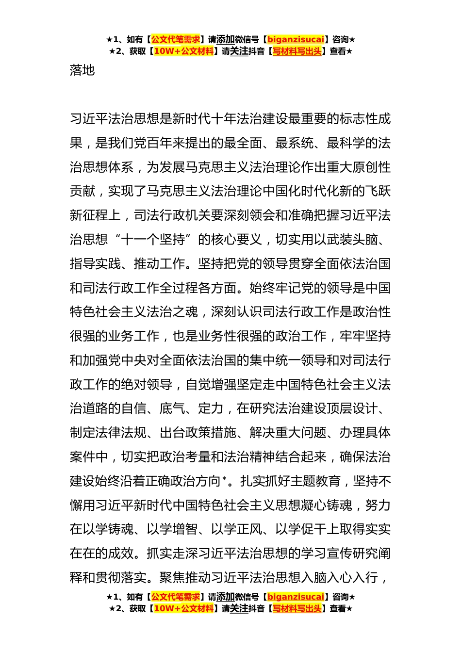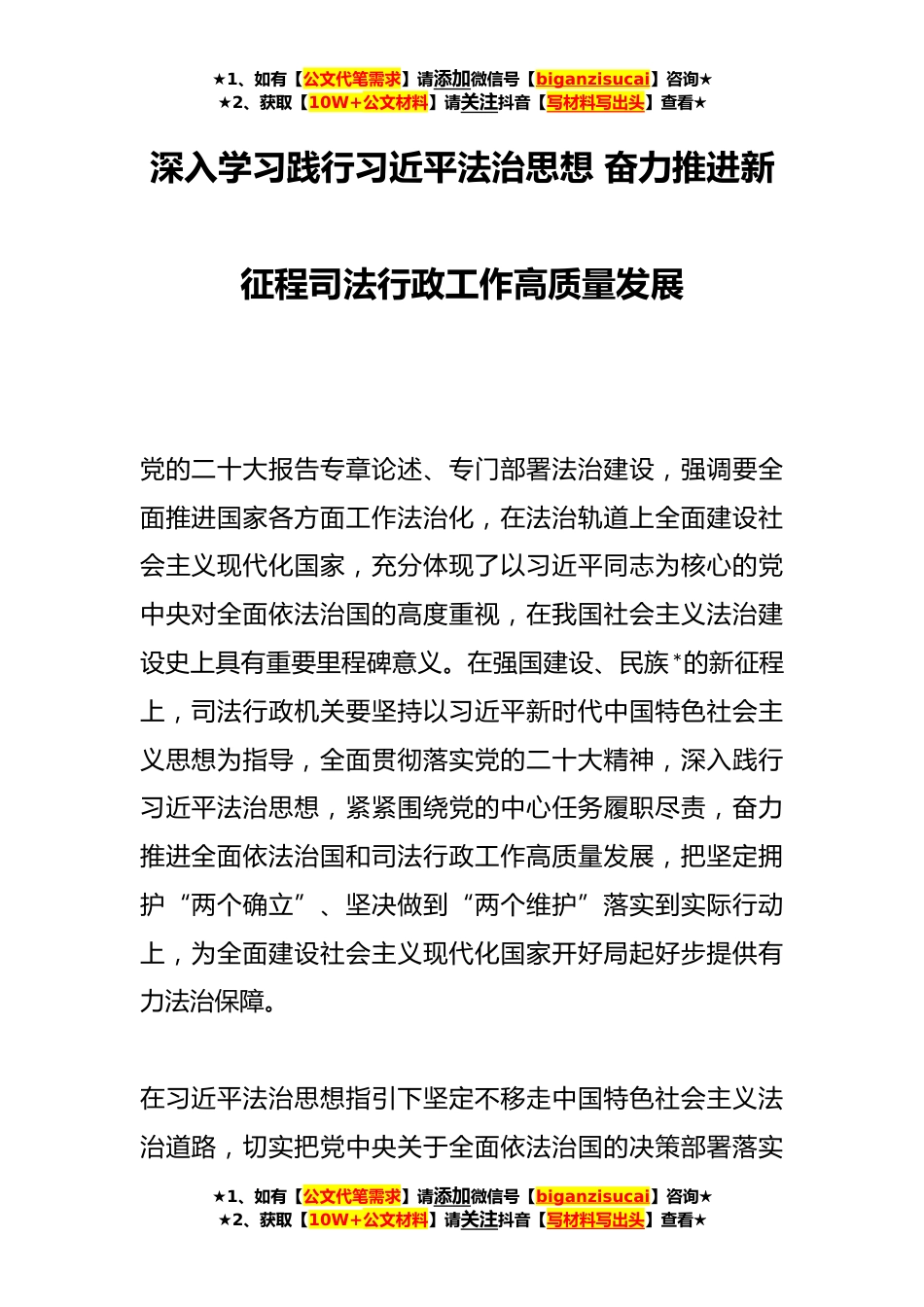★1、如有【公文代笔需求】请添加微信号【biganzisucai】咨询★★2、获取【10W+公文材料】请关注抖音【写材料写出头】查看★深入学习践行习近平法治思想奋力推进新征程司法行政工作高质量发展党的二十大报告专章论述、专门部署法治建设,强调要全面推进国家各方面工作法治化,在法治轨道上全面建设社会主义现代化国家,充分体现了以习近平同志为核心的党中央对全面依法治国的高度重视,在我国社会主义法治建设史上具有重要里程碑意义。在强国建设、民族*的新征程上,司法行政机关要坚持以习近平新时代中国特色社会主义思想为指导,全面贯彻落实党的二十大精神,深入践行习近平法治思想,紧紧围绕党的中心任务履职尽责,奋力推进全面依法治国和司法行政工作高质量发展,把坚定拥护“两个确立”、坚决做到“两个维护...