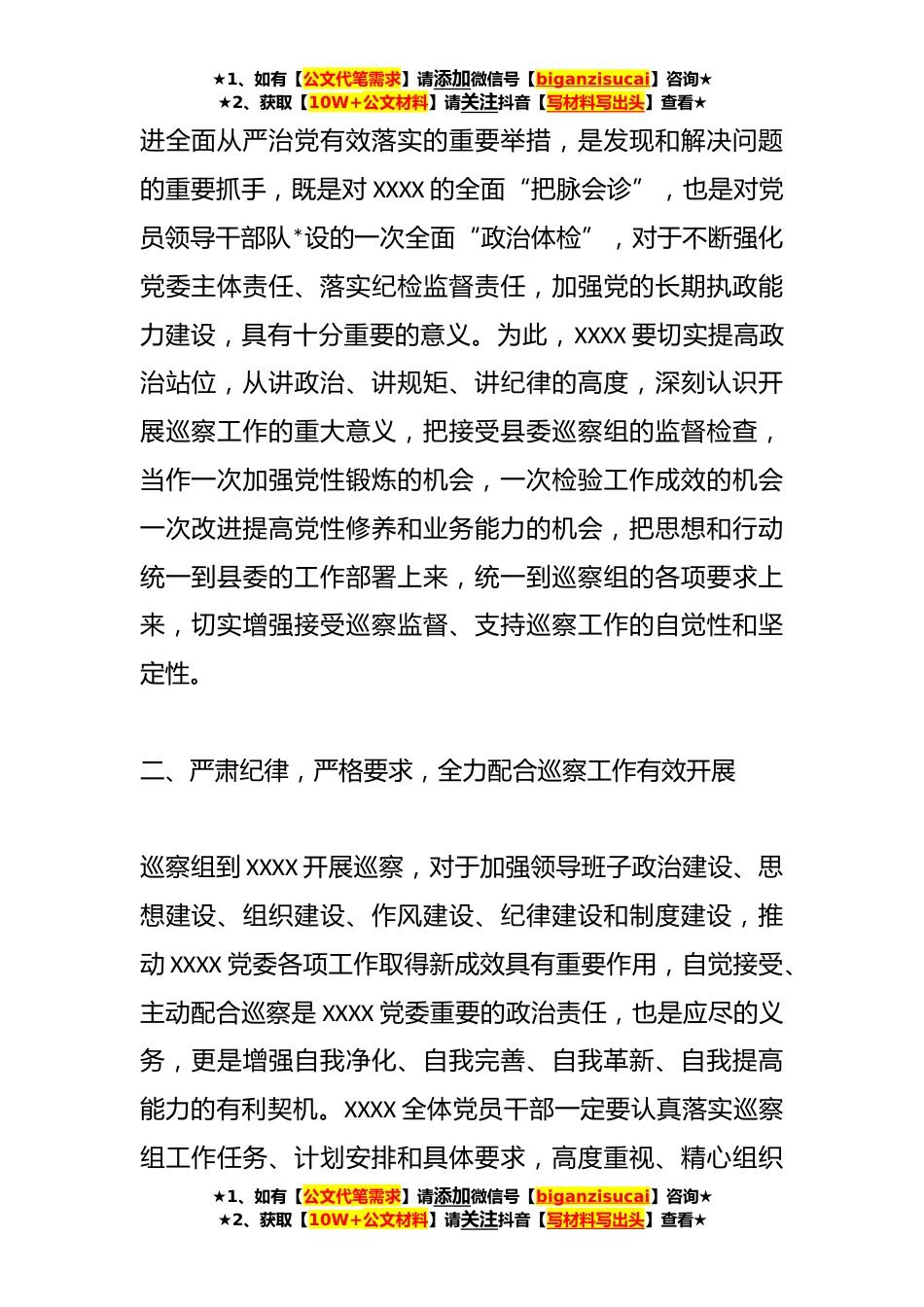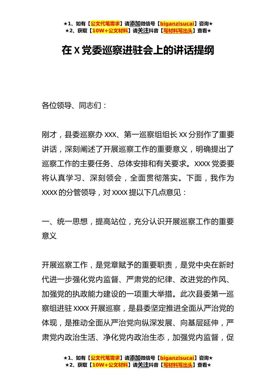 ★1、如有【公文代笔需求】请添加微信号【biganzisucai】咨询★★2、获取【10W+公文材料】请关注抖音【写材料写出头】查看★在X党委巡察进驻会上的讲话提纲各位领导、同志们:刚才,县委巡察办XXX、第一巡察组组长XX分别作了重要讲话,深刻阐述了开展巡察工作的重要意义,明确提出了巡察工作的主要任务、总体安排和有关要求。XXXX党委要将认真学习、深刻领会,全面贯彻落实。下面,我作为XXXX的分管领导,对XXXX提以下几点意见:一、统一思想,提高站位,充分认识开展巡察工作的重要意义开展巡察工作,是党章赋予的重要职责,是党中央在新时代进一步强化党内监督、严肃党的纪律、改进党的作风、加强党的执政能力建设的一项重大举措。此次县委第一巡察组进驻XXXX开展巡察,是县委坚定推进全面从严治党的体现,是推...