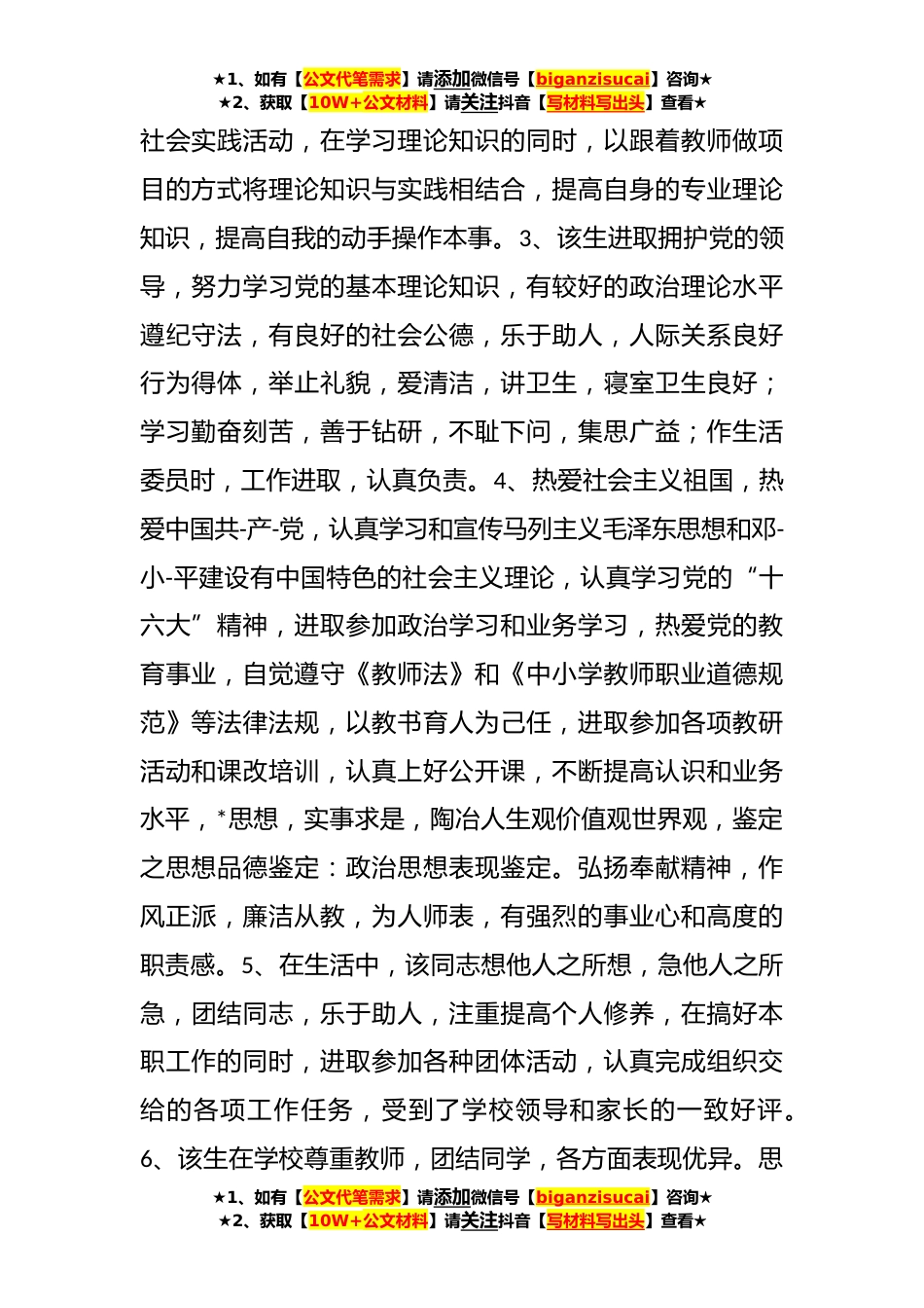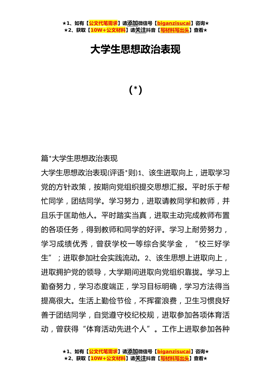 ★1、如有【公文代笔需求】请添加微信号【biganzisucai】咨询★★2、获取【10W+公文材料】请关注抖音【写材料写出头】查看★大学生思想政治表现(*)篇*大学生思想政治表现大学生思想政治表现(评语*则)1、该生进取向上,进取学习党的方针政策,按期向党组织提交思想汇报。平时乐于帮忙同学,团结同学。学习努力,进取请教同学和教师,并且乐于匡助他人。平时踏实当真,进取主动完成教师布置的各项任务,得到教师和同学的好评。学习上耐劳努力,学习成绩优秀,曾获学校一等综合奖学金,“校三好学生”;进取参加社会实践流动。2、该生思想上进取向上,进取拥护党的领导,大学期间进取向党组织靠拢。学习上勤奋努力,学习态度端正,学习目标明确,学习方法得当提高很大。生活上勤俭节俭,不挥霍浪费,卫生习惯良好善...
