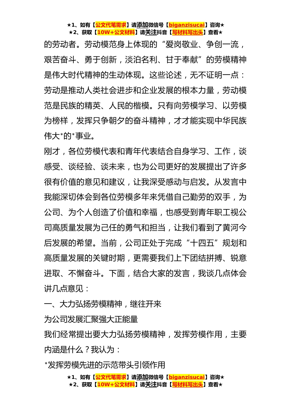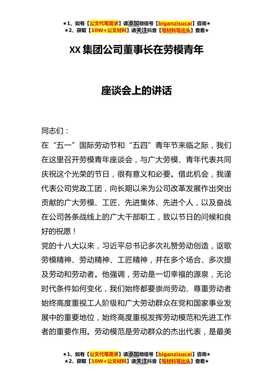 ★1、如有【公文代笔需求】请添加微信号【biganzisucai】咨询★★2、获取【10W+公文材料】请关注抖音【写材料写出头】查看★XX集团公司董事长在劳模青年座谈会上的讲话同志们:在“五一”国际劳动节和“五四”青年节来临之际,我们在这里召开劳模青年座谈会,与广大劳模、青年代表共同庆祝这个光荣的节日,很有意义和必要。借此机会,我谨代表公司党政工团,向长期以来为公司改革发展作出突出贡献的广大劳模、工匠、先进集体、先进个人,以及奋战在公司各条战线上的广大干部职工,致以节日的问候和良好的祝愿!党的十八大以来,习近平总书记多次礼赞劳动创造,讴歌劳模精神、劳动精神、工匠精神,并在多个场合、多次提及劳动和劳动者。他强调,劳动是一切幸福的源泉,无论时代条件如何变化,我们始终都要崇尚劳动...
