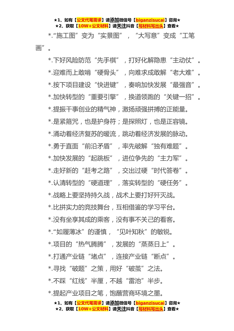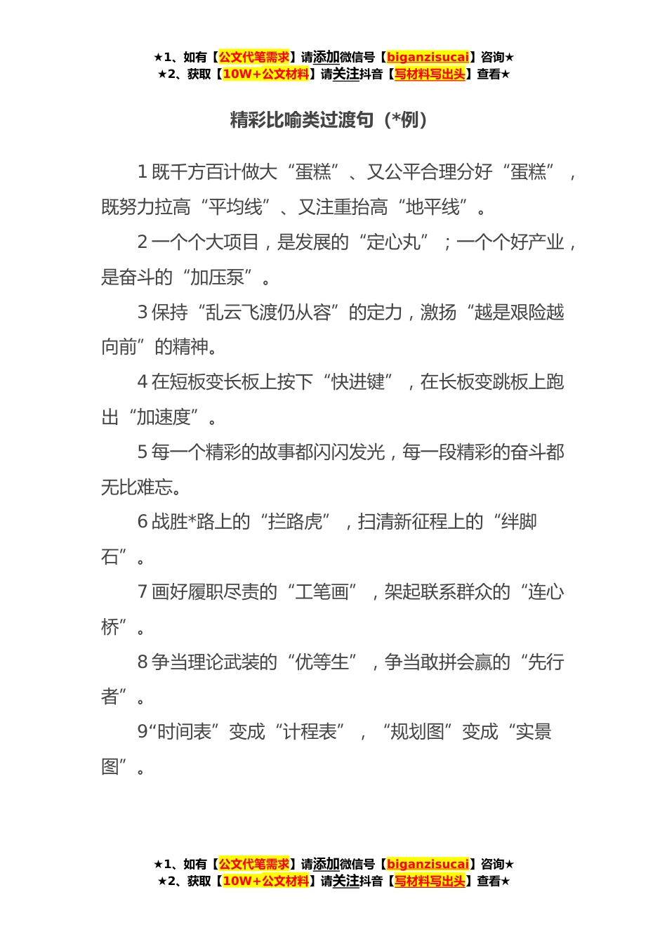 ★1、如有【公文代笔需求】请添加微信号【biganzisucai】咨询★★2、获取【10W+公文材料】请关注抖音【写材料写出头】查看★精彩比喻类过渡句(*例)1既千方百计做大“蛋糕”、又公平合理分好“蛋糕”,既努力拉高“平均线”、又注重抬高“地平线”。2一个个大项目,是发展的“定心丸”;一个个好产业,是奋斗的“加压泵”。3保持“乱云飞渡仍从容”的定力,激扬“越是艰险越向前”的精神。4在短板变长板上按下“快进键”,在长板变跳板上跑出“加速度”。5每一个精彩的故事都闪闪发光,每一段精彩的奋斗都无比难忘。6战胜*路上的“拦路虎”,扫清新征程上的“绊脚石”。7画好履职尽责的“工笔画”,架起联系群众的“连心桥”。8争当理论武装的“优等生”,争当敢拼会赢的“先行者”。9“时间表”变成“计程表”,...