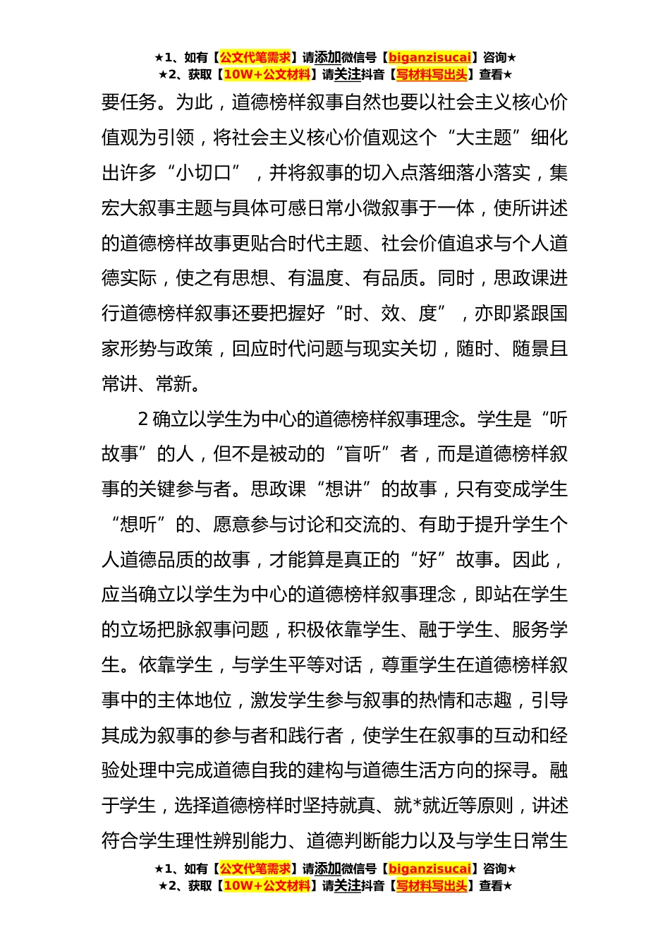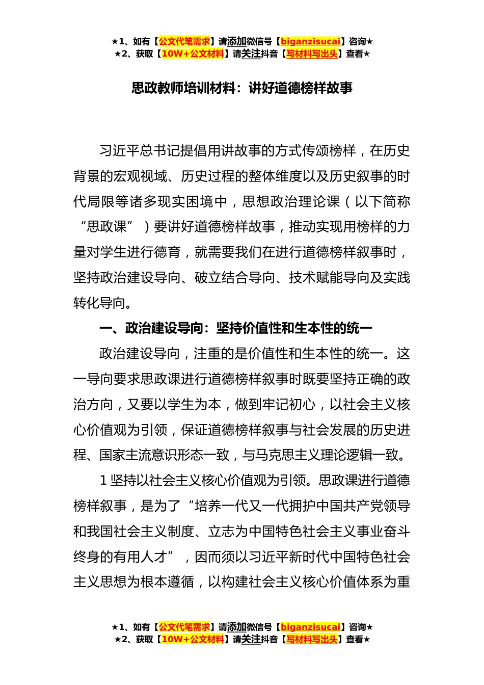 ★1、如有【公文代笔需求】请添加微信号【biganzisucai】咨询★★2、获取【10W+公文材料】请关注抖音【写材料写出头】查看★思政教师培训材料:讲好道德榜样故事习近平总书记提倡用讲故事的方式传颂榜样,在历史背景的宏观视域、历史过程的整体维度以及历史叙事的时代局限等诸多现实困境中,思想政治理论课(以下简称“思政课”)要讲好道德榜样故事,推动实现用榜样的力量对学生进行德育,就需要我们在进行道德榜样叙事时,坚持政治建设导向、破立结合导向、技术赋能导向及实践转化导向。一、政治建设导向:坚持价值性和生本性的统一政治建设导向,注重的是价值性和生本性的统一。这一导向要求思政课进行道德榜样叙事时既要坚持正确的政治方向,又要以学生为本,做到牢记初心,以社会主义核心价值观为引领,保证...