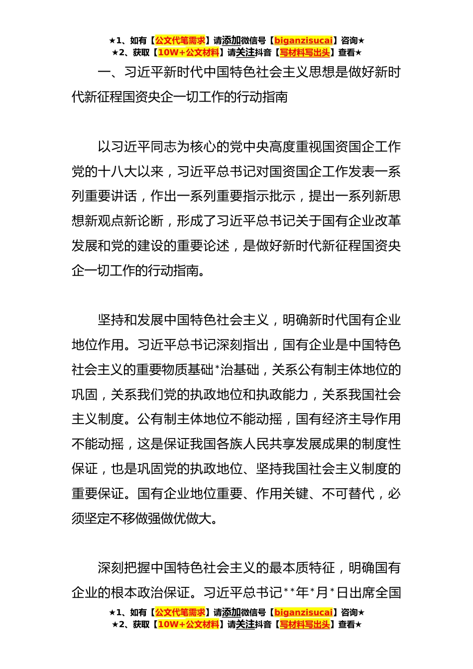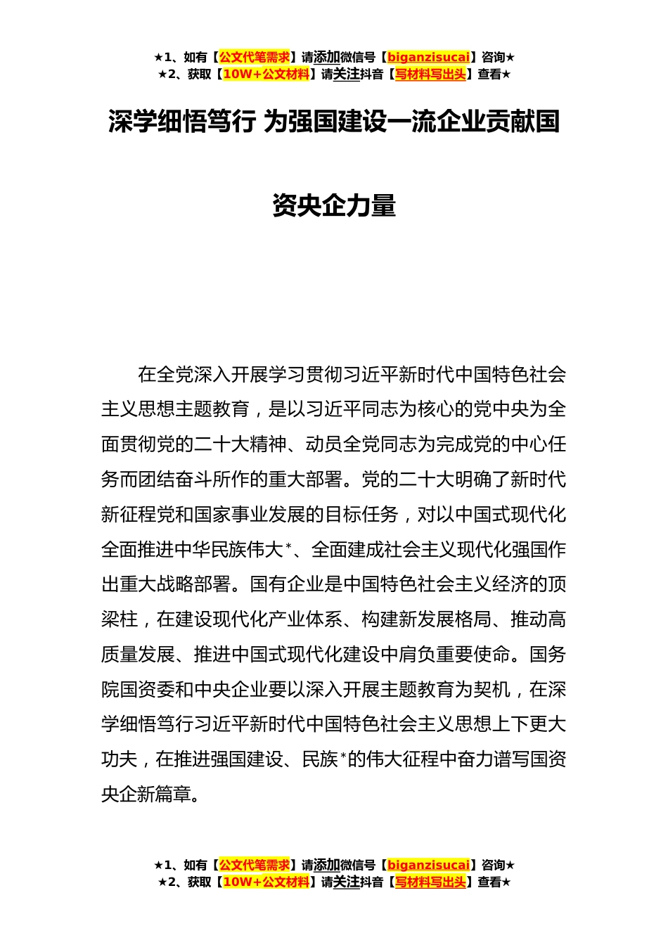 ★1、如有【公文代笔需求】请添加微信号【biganzisucai】咨询★★2、获取【10W+公文材料】请关注抖音【写材料写出头】查看★深学细悟笃行为强国建设一流企业贡献国资央企力量在全党深入开展学习贯彻习近平新时代中国特色社会主义思想主题教育,是以习近平同志为核心的党中央为全面贯彻党的二十大精神、动员全党同志为完成党的中心任务而团结奋斗所作的重大部署。党的二十大明确了新时代新征程党和国家事业发展的目标任务,对以中国式现代化全面推进中华民族伟大*、全面建成社会主义现代化强国作出重大战略部署。国有企业是中国特色社会主义经济的顶梁柱,在建设现代化产业体系、构建新发展格局、推动高质量发展、推进中国式现代化建设中肩负重要使命。国务院国资委和中央企业要以深入开展主题教育为契机,在深学细...