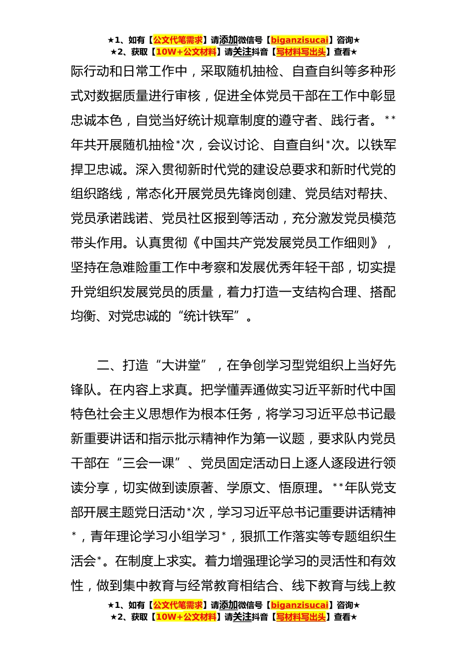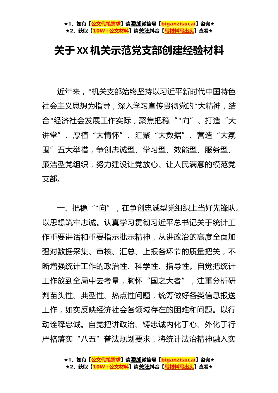 ★1、如有【公文代笔需求】请添加微信号【biganzisucai】咨询★★2、获取【10W+公文材料】请关注抖音【写材料写出头】查看★关于XX机关示范党支部创建经验材料近年来,*机关支部始终坚持以习近平新时代中国特色社会主义思想为指导,深入学习宣传贯彻党的*大精神,结合*经济社会发展工作实际,聚焦把稳“*向”、打造“大讲堂”、厚植“大情怀”、汇聚“大数据”、营造“大氛围”五大举措,争创忠诚型、学习型、效能型、服务型、廉洁型党组织,努力建设让党放心、让人民满意的模范党支部。一、把稳“*向”,在争创忠诚型党组织上当好先锋队。以思想筑牢忠诚。认真学习贯彻习近平总书记关于统计工作重要讲话和重要指示批示精神,从讲政治的高度全面加强对数据采集、审核、汇总、上报各环节的质量把关,不断增强统计工...