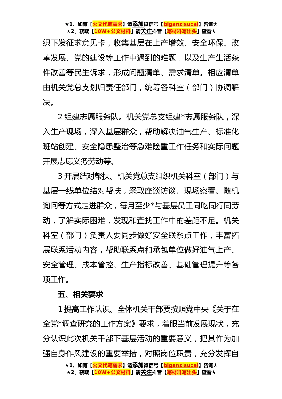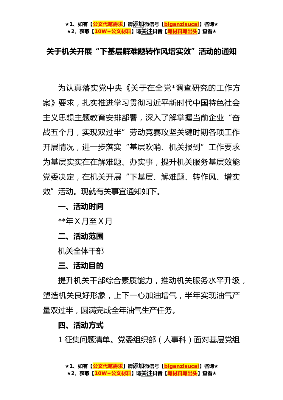 ★1、如有【公文代笔需求】请添加微信号【biganzisucai】咨询★★2、获取【10W+公文材料】请关注抖音【写材料写出头】查看★关于机关开展“下基层解难题转作风增实效”活动的通知为认真落实党中央《关于在全党*调查研究的工作方案》要求,扎实推进学习贯彻习近平新时代中国特色社会主义思想主题教育安排部署,深入了解掌握当前企业“奋战五个月,实现双过半”劳动竞赛攻坚关键时期各项工作开展情况,进一步落实“基层吹哨、机关报到”工作要求为基层实实在在解难题、办实事,提升机关服务基层效能党委决定,在机关开展“下基层、解难题、转作风、增实效”活动。现就有关事宜通知如下。一、活动时间**年X月至X月二、活动范围机关全体干部三、活动目的提升机关干部综合素质能力,推动机关服务水平升级,塑造机关良好...