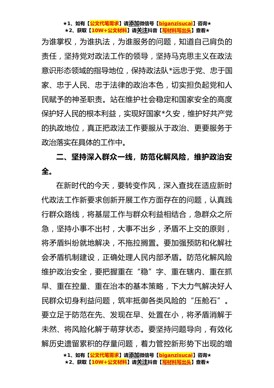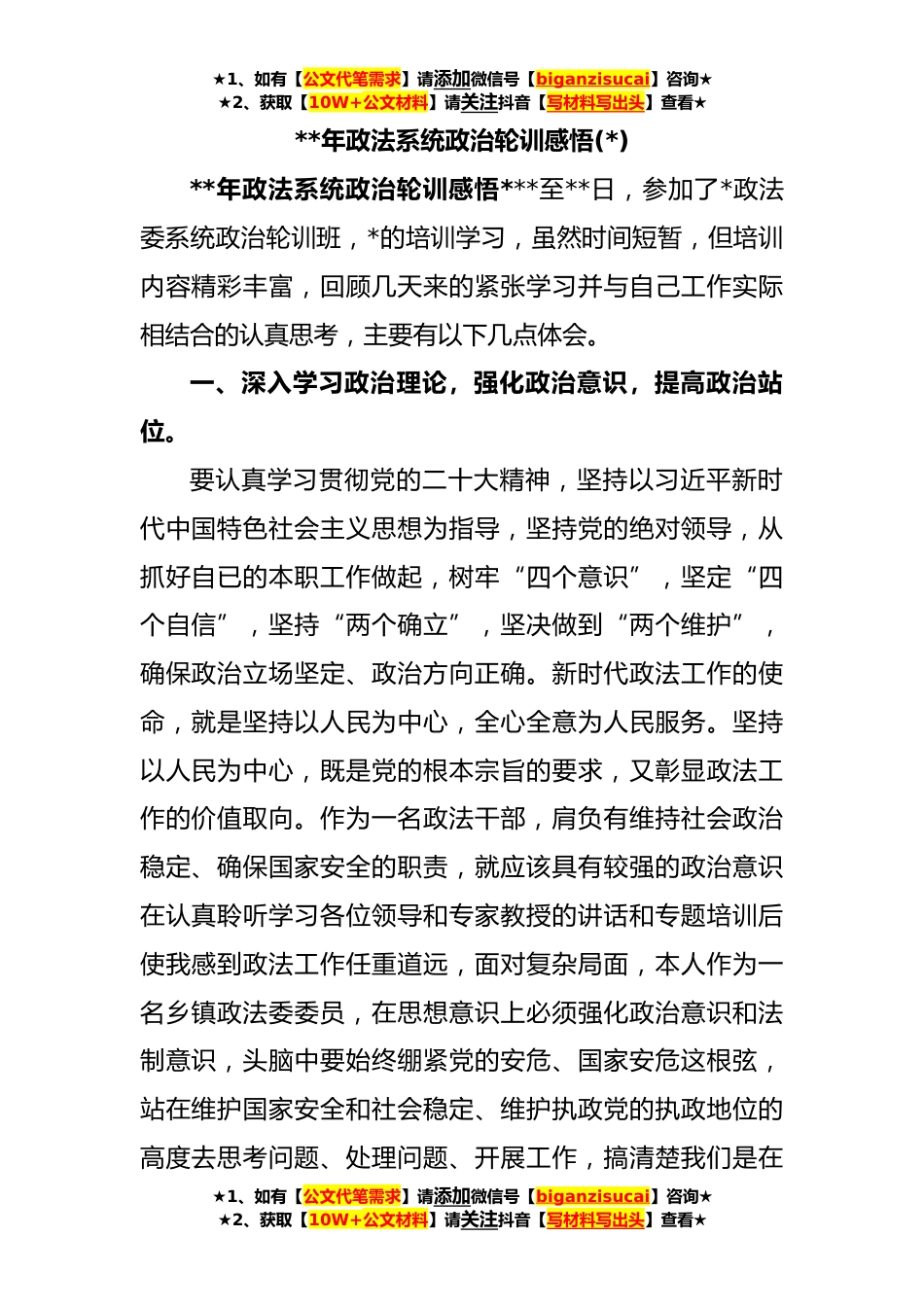 ★1、如有【公文代笔需求】请添加微信号【biganzisucai】咨询★★2、获取【10W+公文材料】请关注抖音【写材料写出头】查看★**年政法系统政治轮训感悟(*)**年政法系统政治轮训感悟***至**日,参加了*政法委系统政治轮训班,*的培训学习,虽然时间短暂,但培训内容精彩丰富,回顾几天来的紧张学习并与自己工作实际相结合的认真思考,主要有以下几点体会。一、深入学习政治理论,强化政治意识,提高政治站位。要认真学习贯彻党的二十大精神,坚持以习近平新时代中国特色社会主义思想为指导,坚持党的绝对领导,从抓好自已的本职工作做起,树牢“四个意识”,坚定“四个自信”,坚持“两个确立”,坚决做到“两个维护”,确保政治立场坚定、政治方向正确。新时代政法工作的使命,就是坚持以人民为中心,全心全意为人...
