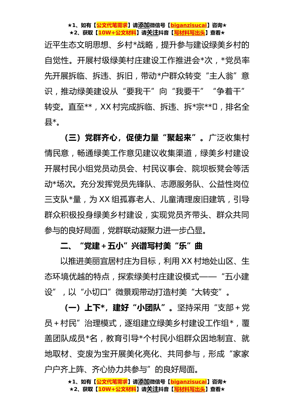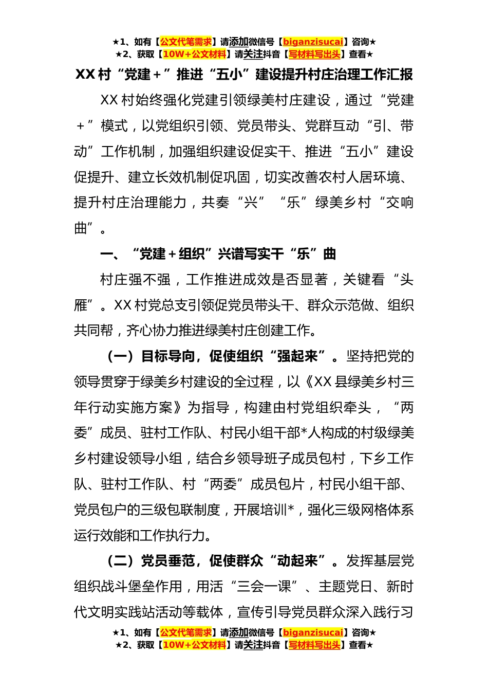 ★1、如有【公文代笔需求】请添加微信号【biganzisucai】咨询★★2、获取【10W+公文材料】请关注抖音【写材料写出头】查看★XX村“党建+”推进“五小”建设提升村庄治理工作汇报XX村始终强化党建引领绿美村庄建设,通过“党建+”模式,以党组织引领、党员带头、党群互动“引、带动”工作机制,加强组织建设促实干、推进“五小”建设促提升、建立长效机制促巩固,切实改善农村人居环境、提升村庄治理能力,共奏“兴”“乐”绿美乡村“交响曲”。一、“党建+组织”兴谱写实干“乐”曲村庄强不强,工作推进成效是否显著,关键看“头雁”。XX村党总支引领促党员带头干、群众示范做、组织共同帮,齐心协力推进绿美村庄创建工作。(一)目标导向,促使组织“强起来”。坚持把党的领导贯穿于绿美乡村建设的全过程,以...