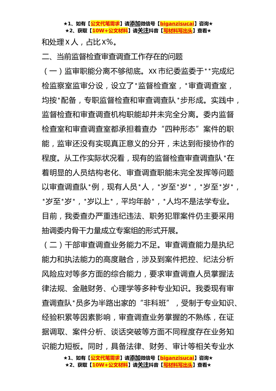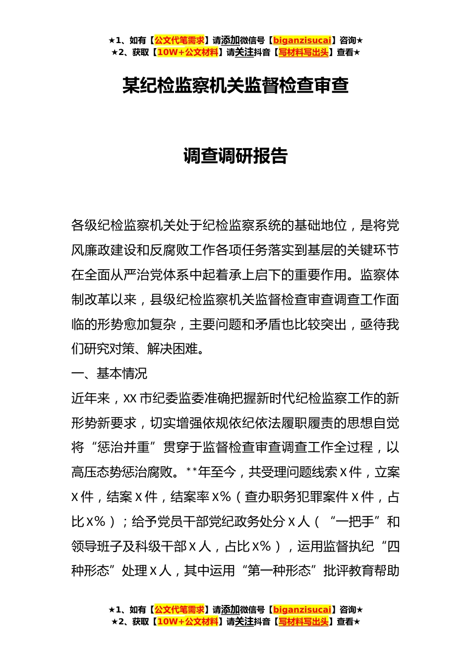 ★1、如有【公文代笔需求】请添加微信号【biganzisucai】咨询★★2、获取【10W+公文材料】请关注抖音【写材料写出头】查看★某纪检监察机关监督检查审查调查调研报告各级纪检监察机关处于纪检监察系统的基础地位,是将党风廉政建设和反腐败工作各项任务落实到基层的关键环节在全面从严治党体系中起着承上启下的重要作用。监察体制改革以来,县级纪检监察机关监督检查审查调查工作面临的形势愈加复杂,主要问题和矛盾也比较突出,亟待我们研究对策、解决困难。一、基本情况近年来,XX市纪委监委准确把握新时代纪检监察工作的新形势新要求,切实增强依规依纪依法履职履责的思想自觉将“惩治并重”贯穿于监督检查审查调查工作全过程,以高压态势惩治腐败。**年至今,共受理问题线索X件,立案X件,结案X件,结案率X%...