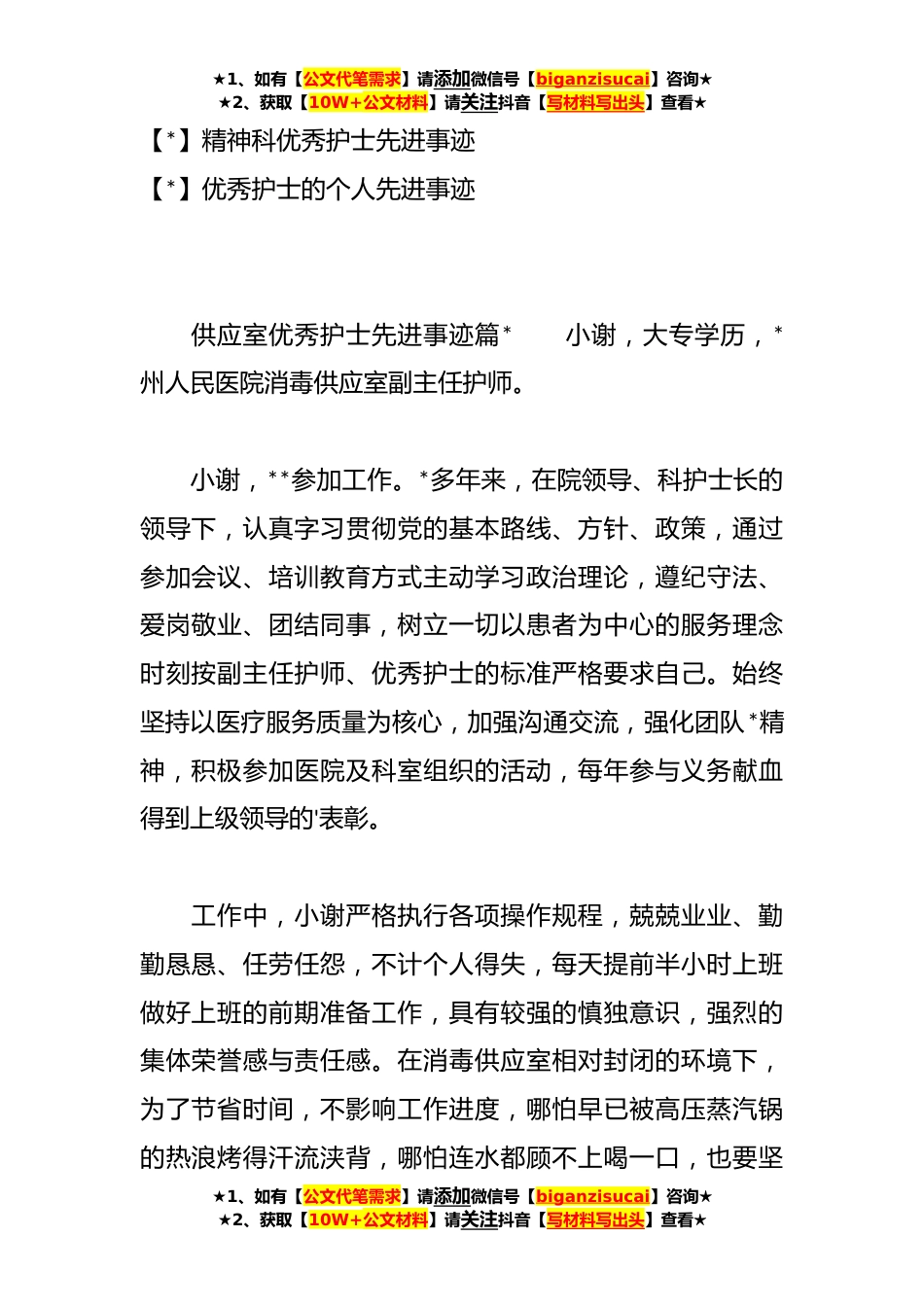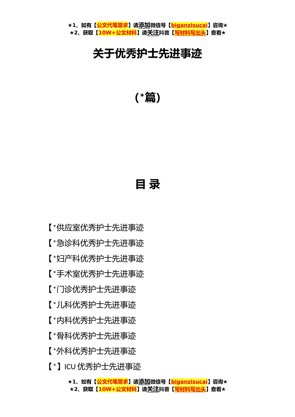★1、如有【公文代笔需求】请添加微信号【biganzisucai】咨询★★2、获取【10W+公文材料】请关注抖音【写材料写出头】查看★关于优秀护士先进事迹(*篇)目录【*供应室优秀护士先进事迹【*急诊科优秀护士先进事迹【*妇产科优秀护士先进事迹【*手术室优秀护士先进事迹【*门诊优秀护士先进事迹【*儿科优秀护士先进事迹【*内科优秀护士先进事迹【*骨科优秀护士先进事迹【*外科优秀护士先进事迹【*】ICU优秀护士先进事迹★1、如有【公文代笔需求】请添加微信号【biganzisucai】咨询★★2、获取【10W+公文材料】请关注抖音【写材料写出头】查看★★1、如有【公文代笔需求】请添加微信号【biganzisucai】咨询★★2、获取【10W+公文材料】请关注抖音【写材料写出头】查看★【*】精神科优秀护士先进事迹【*】优秀护士的个...
