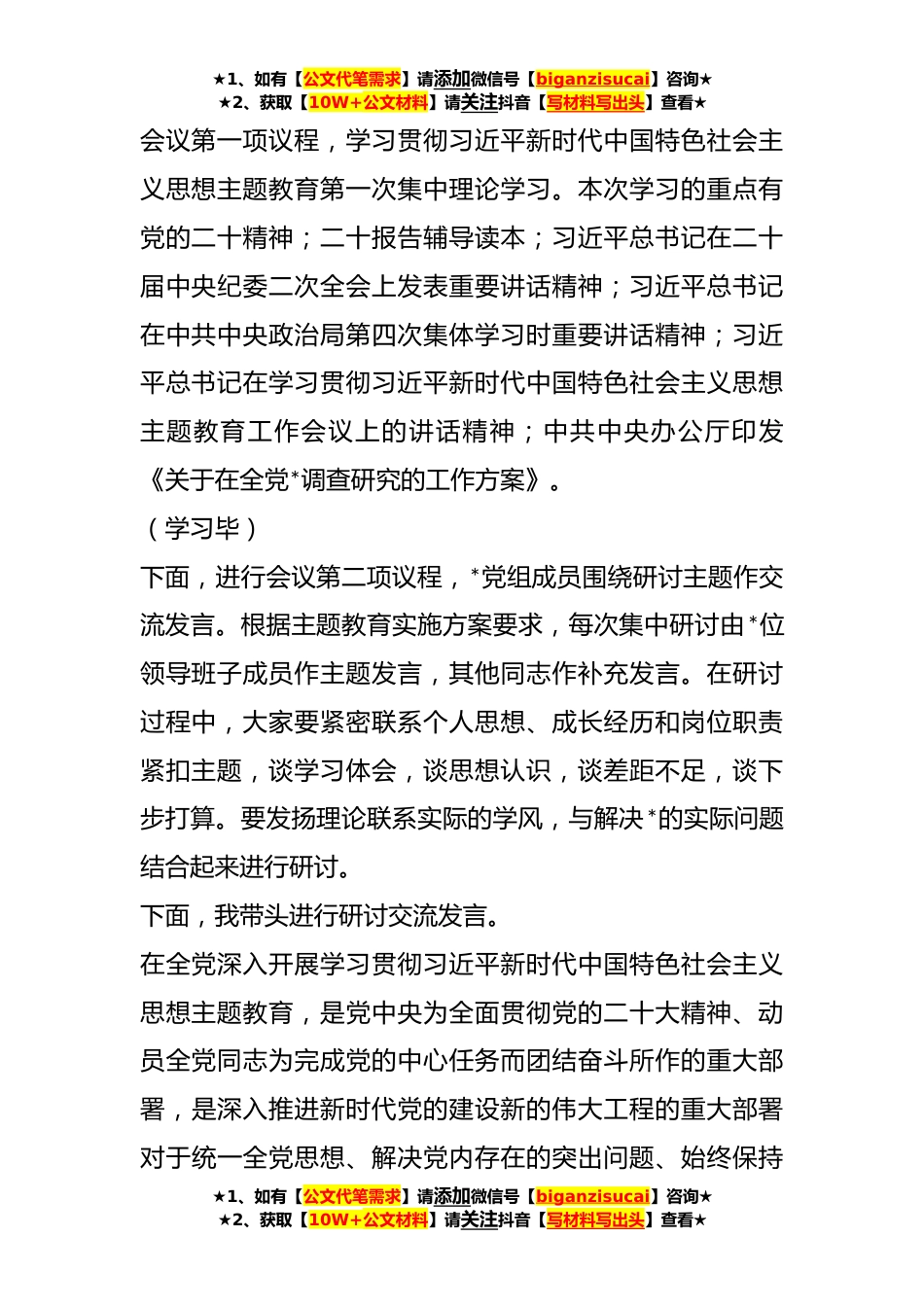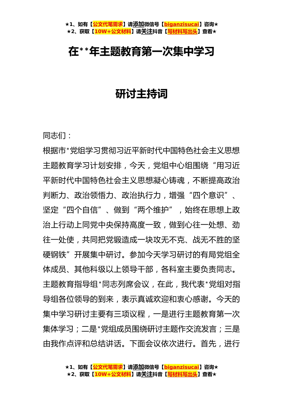 ★1、如有【公文代笔需求】请添加微信号【biganzisucai】咨询★★2、获取【10W+公文材料】请关注抖音【写材料写出头】查看★在**年主题教育第一次集中学习研讨主持词同志们:根据市*党组学习贯彻习近平新时代中国特色社会主义思想主题教育学习计划安排,今天,党组中心组围绕“用习近平新时代中国特色社会主义思想凝心铸魂,不断提高政治判断力、政治领悟力、政治执行力,增强“四个意识”、坚定“四个自信”、做到“两个维护”,始终在思想上政治上行动上同党中央保持高度一致,做到心往一处想、劲往一处使,共同把党锻造成一块攻无不克、战无不胜的坚硬钢铁”开展集中研讨。参加今天学习研讨的有局党组全体成员、其他科级以上领导干部,各科室主要负责同志。主题教育指导组*同志列席会议,在此,我代表*党组对指...