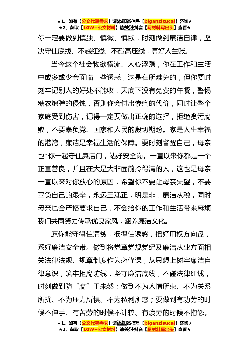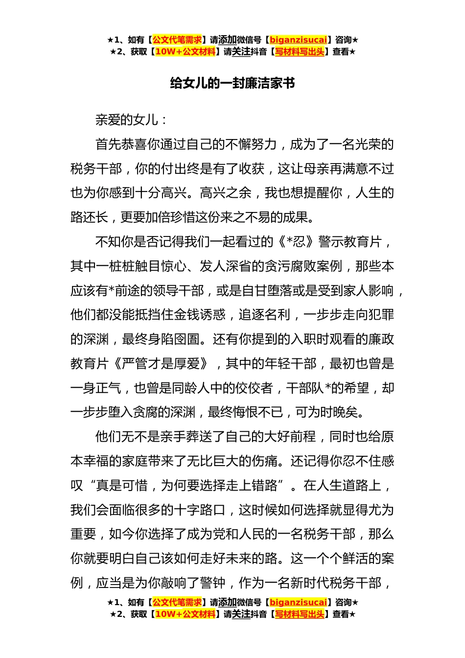 ★1、如有【公文代笔需求】请添加微信号【biganzisucai】咨询★★2、获取【10W+公文材料】请关注抖音【写材料写出头】查看★给女儿的一封廉洁家书亲爱的女儿:首先恭喜你通过自己的不懈努力,成为了一名光荣的税务干部,你的付出终是有了收获,这让母亲再满意不过也为你感到十分高兴。高兴之余,我也想提醒你,人生的路还长,更要加倍珍惜这份来之不易的成果。不知你是否记得我们一起看过的《*忍》警示教育片,其中一桩桩触目惊心、发人深省的贪污腐败案例,那些本应该有*前途的领导干部,或是自甘堕落或是受到家人影响,他们都没能抵挡住金钱诱惑,追逐名利,一步步走向犯罪的深渊,最终身陷囹圄。还有你提到的入职时观看的廉政教育片《严管才是厚爱》,其中的年轻干部,最初也曾是一身正气,也曾是同龄人中的佼...