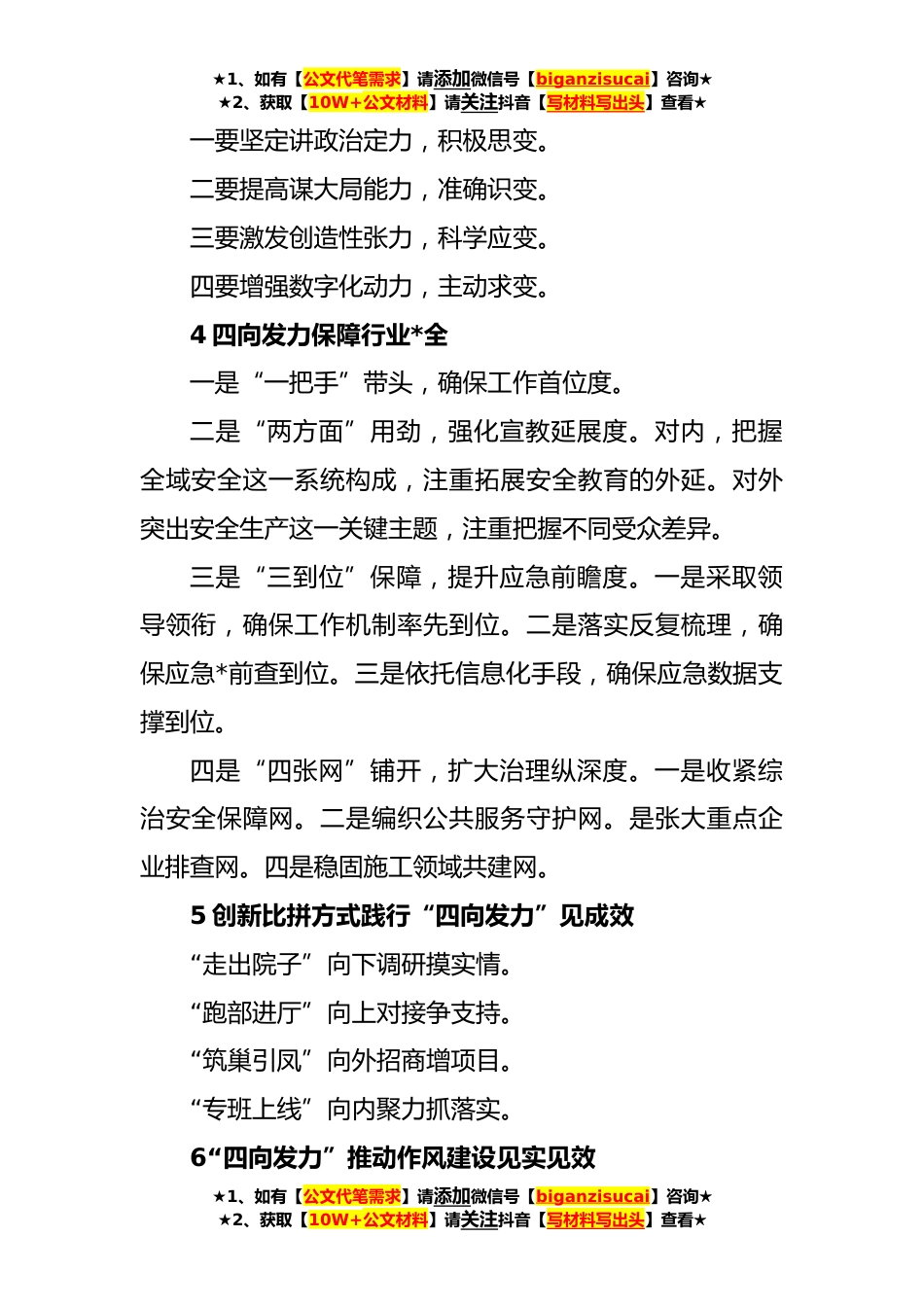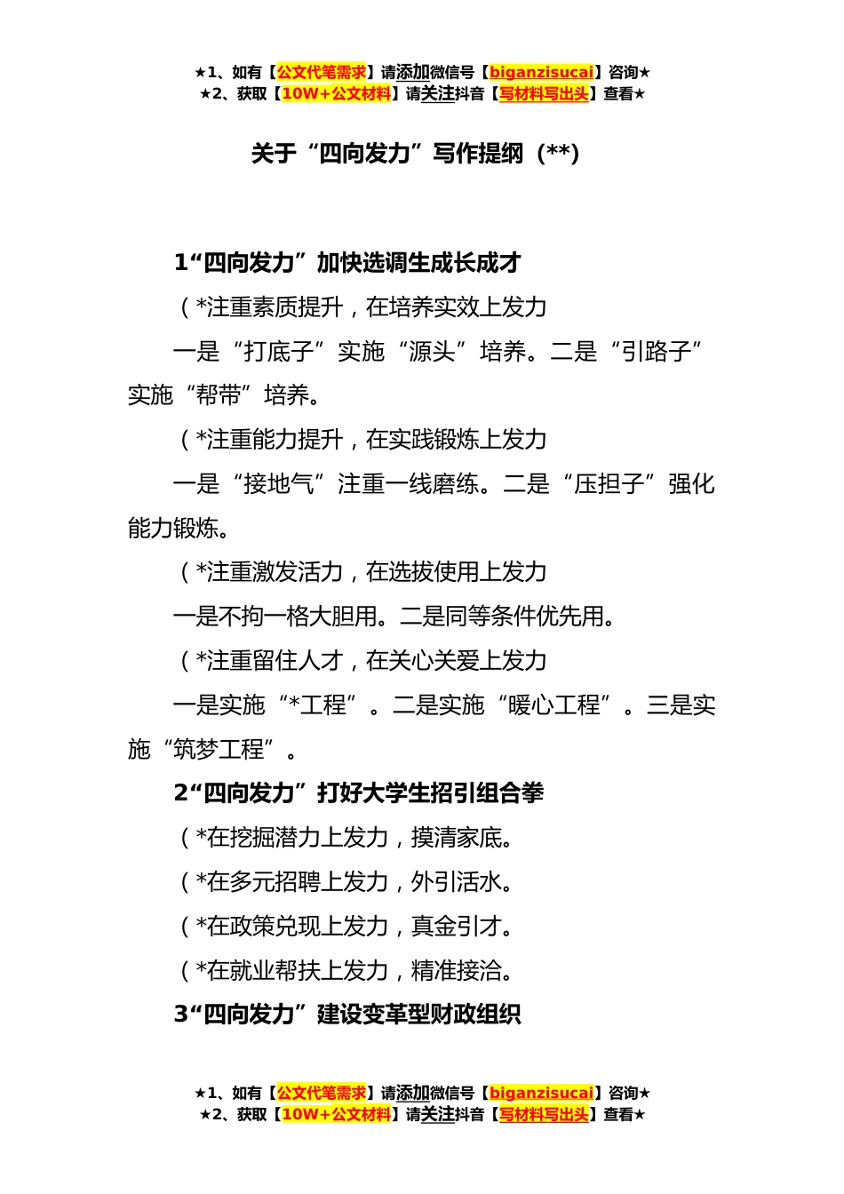 ★1、如有【公文代笔需求】请添加微信号【biganzisucai】咨询★★2、获取【10W+公文材料】请关注抖音【写材料写出头】查看★关于“四向发力”写作提纲(**)1“四向发力”加快选调生成长成才(*注重素质提升,在培养实效上发力一是“打底子”实施“源头”培养。二是“引路子”实施“帮带”培养。(*注重能力提升,在实践锻炼上发力一是“接地气”注重一线磨练。二是“压担子”强化能力锻炼。(*注重激发活力,在选拔使用上发力一是不拘一格大胆用。二是同等条件优先用。(*注重留住人才,在关心关爱上发力一是实施“*工程”。二是实施“暖心工程”。三是实施“筑梦工程”。2“四向发力”打好大学生招引组合拳(*在挖掘潜力上发力,摸清家底。(*在多元招聘上发力,外引活水。(*在政策兑现上发力,真金引才。(*在...