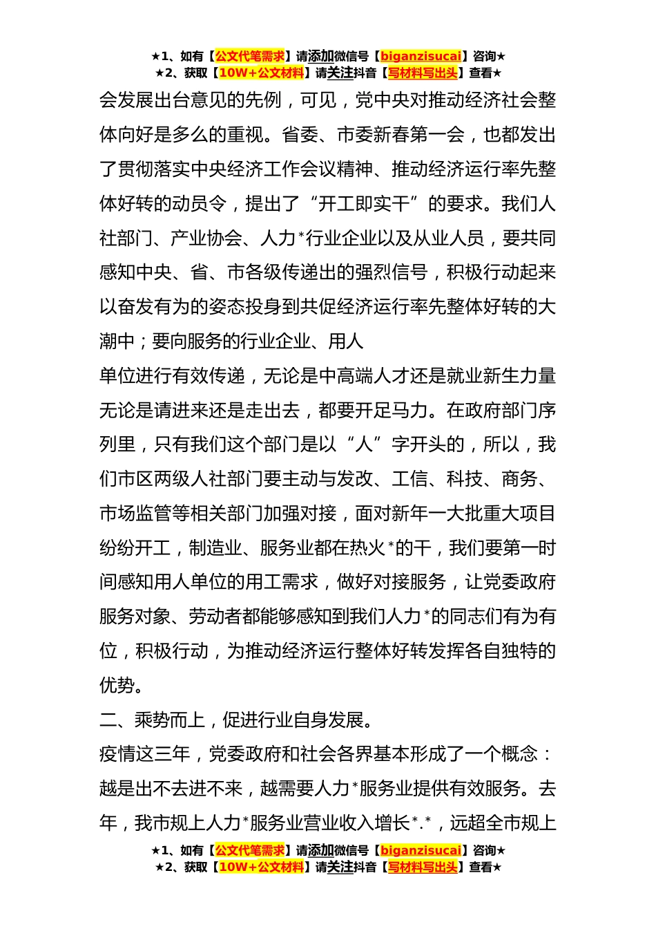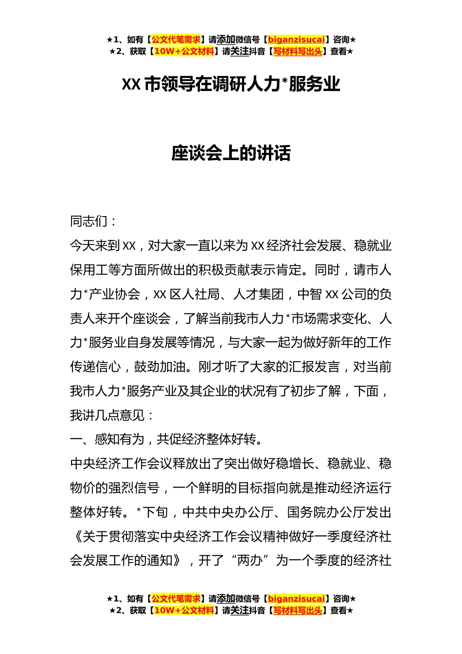 ★1、如有【公文代笔需求】请添加微信号【biganzisucai】咨询★★2、获取【10W+公文材料】请关注抖音【写材料写出头】查看★XX市领导在调研人力*服务业座谈会上的讲话同志们:今天来到XX,对大家一直以来为XX经济社会发展、稳就业保用工等方面所做出的积极贡献表示肯定。同时,请市人力*产业协会,XX区人社局、人才集团,中智XX公司的负责人来开个座谈会,了解当前我市人力*市场需求变化、人力*服务业自身发展等情况,与大家一起为做好新年的工作传递信心,鼓劲加油。刚才听了大家的汇报发言,对当前我市人力*服务产业及其企业的状况有了初步了解,下面,我讲几点意见:一、感知有为,共促经济整体好转。中央经济工作会议释放出了突出做好稳增长、稳就业、稳物价的强烈信号,一个鲜明的目标指向就是推动经济运行整...
