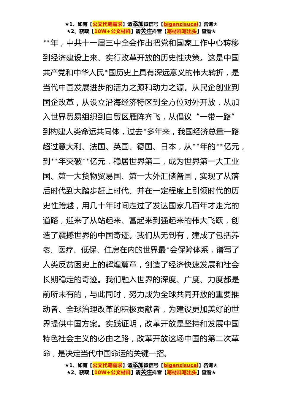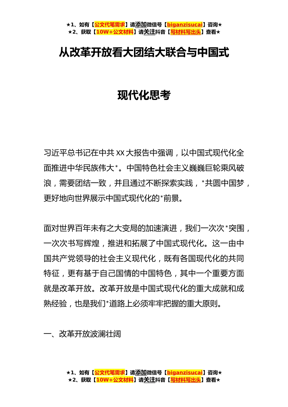 ★1、如有【公文代笔需求】请添加微信号【biganzisucai】咨询★★2、获取【10W+公文材料】请关注抖音【写材料写出头】查看★从改革开放看大团结大联合与中国式现代化思考习近平总书记在中共XX大报告中强调,以中国式现代化全面推进中华民族伟大*。中国特色社会主义巍巍巨轮乘风破浪,需要团结一致,并且通过不断探索实践,*共圆中国梦,更好地向世界展示中国式现代化的*前景。面对世界百年未有之大变局的加速演进,我们一次次*突围,一次次书写辉煌,推进和拓展了中国式现代化。这一由中国共产党领导的社会主义现代化,既有各国现代化的共同特征,更有基于自己国情的中国特色,其中一个重要方面就是改革开放。改革开放是中国式现代化的重大成就和成熟经验,也是我们*道路上必须牢牢把握的重大原则。一、改革开放波...