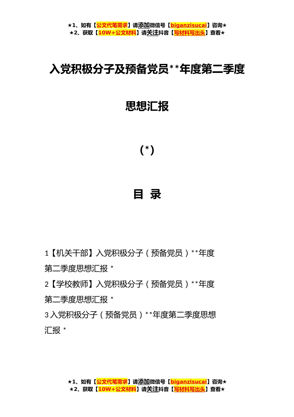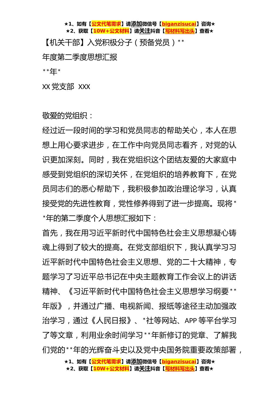 ★1、如有【公文代笔需求】请添加微信号【biganzisucai】咨询★★2、获取【10W+公文材料】请关注抖音【写材料写出头】查看★入党积极分子及预备党员**年度第二季度思想汇报(*)目录1【机关干部】入党积极分子(预备党员)**年度第二季度思想汇报*2【学校教师】入党积极分子(预备党员)**年度第二季度思想汇报*3入党积极分子(预备党员)**年度第二季度思想汇报*★1、如有【公文代笔需求】请添加微信号【biganzisucai】咨询★★2、获取【10W+公文材料】请关注抖音【写材料写出头】查看★★1、如有【公文代笔需求】请添加微信号【biganzisucai】咨询★★2、获取【10W+公文材料】请关注抖音【写材料写出头】查看★【机关干部】入党积极分子(预备党员)**年度第二季度思想汇报**年*XX党支部XXX敬爱的党组织:经过近...