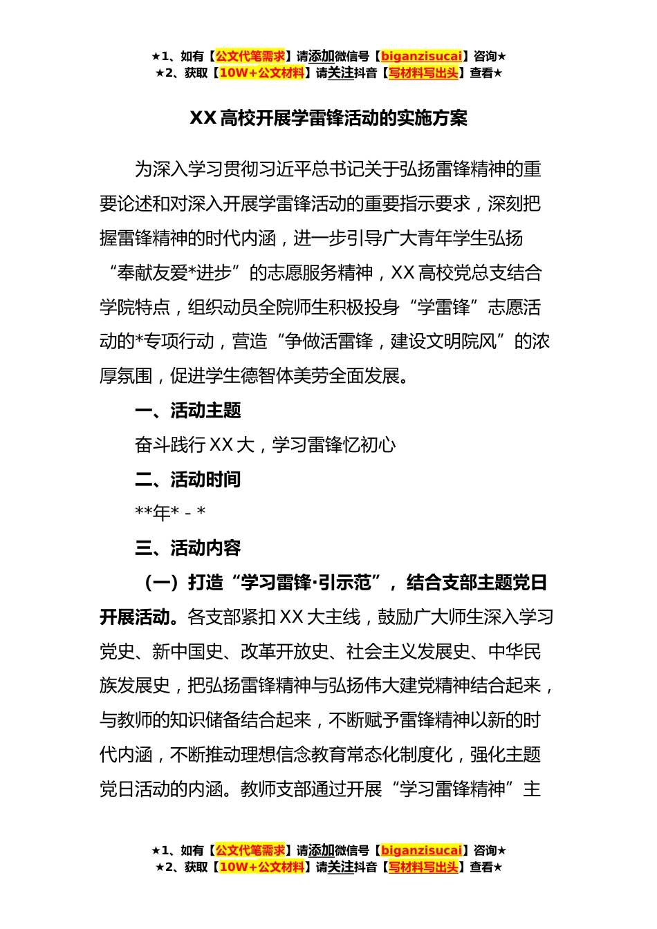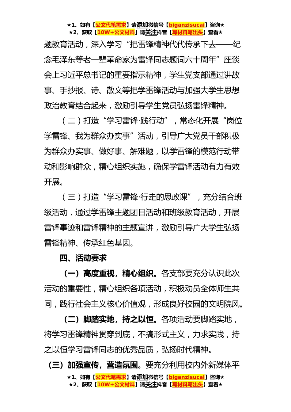 ★1、如有【公文代笔需求】请添加微信号【biganzisucai】咨询★★2、获取【10W+公文材料】请关注抖音【写材料写出头】查看★XX高校开展学雷锋活动的实施方案为深入学习贯彻习近平总书记关于弘扬雷锋精神的重要论述和对深入开展学雷锋活动的重要指示要求,深刻把握雷锋精神的时代内涵,进一步引导广大青年学生弘扬“奉献友爱*进步”的志愿服务精神,XX高校党总支结合学院特点,组织动员全院师生积极投身“学雷锋”志愿活动的*专项行动,营造“争做活雷锋,建设文明院风”的浓厚氛围,促进学生德智体美劳全面发展。一、活动主题奋斗践行XX大,学习雷锋忆初心二、活动时间**年*-*三、活动内容(一)打造“学习雷锋·引示范”,结合支部主题党日开展活动。各支部紧扣XX大主线,鼓励广大师生深入学习党史、新中国史、...