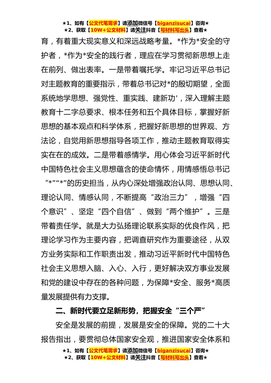 ★1、如有【公文代笔需求】请添加微信号【biganzisucai】咨询★★2、获取【10W+公文材料】请关注抖音【写材料写出头】查看★XX国有企业开展主题教育领导发言材料各位领导,同志们:在全国上下深入学习贯彻党的二十大精神、开展学习贯彻习近平新时代中国特色社会主义思想主题教育之际,*和*开展党建共建,可以说正逢其时。开展此次活动,既是双方全面深入学习新思想、扎实开展主题教育的重要举措也是双方贯彻总体国家安全观、维护*安全的具体行动。我谨代表*,向出席活动的各位领导,表示热烈的欢迎!向一直以来关心支持*发展的各级机构,表示衷心的感谢!从党的十八大开始,中国特色社会主义进入了新时代。党的十九大指出,中国特色社会主义新时代是中国发展新的历史方位。习近平总书记在党的二十大报告中,全面回...