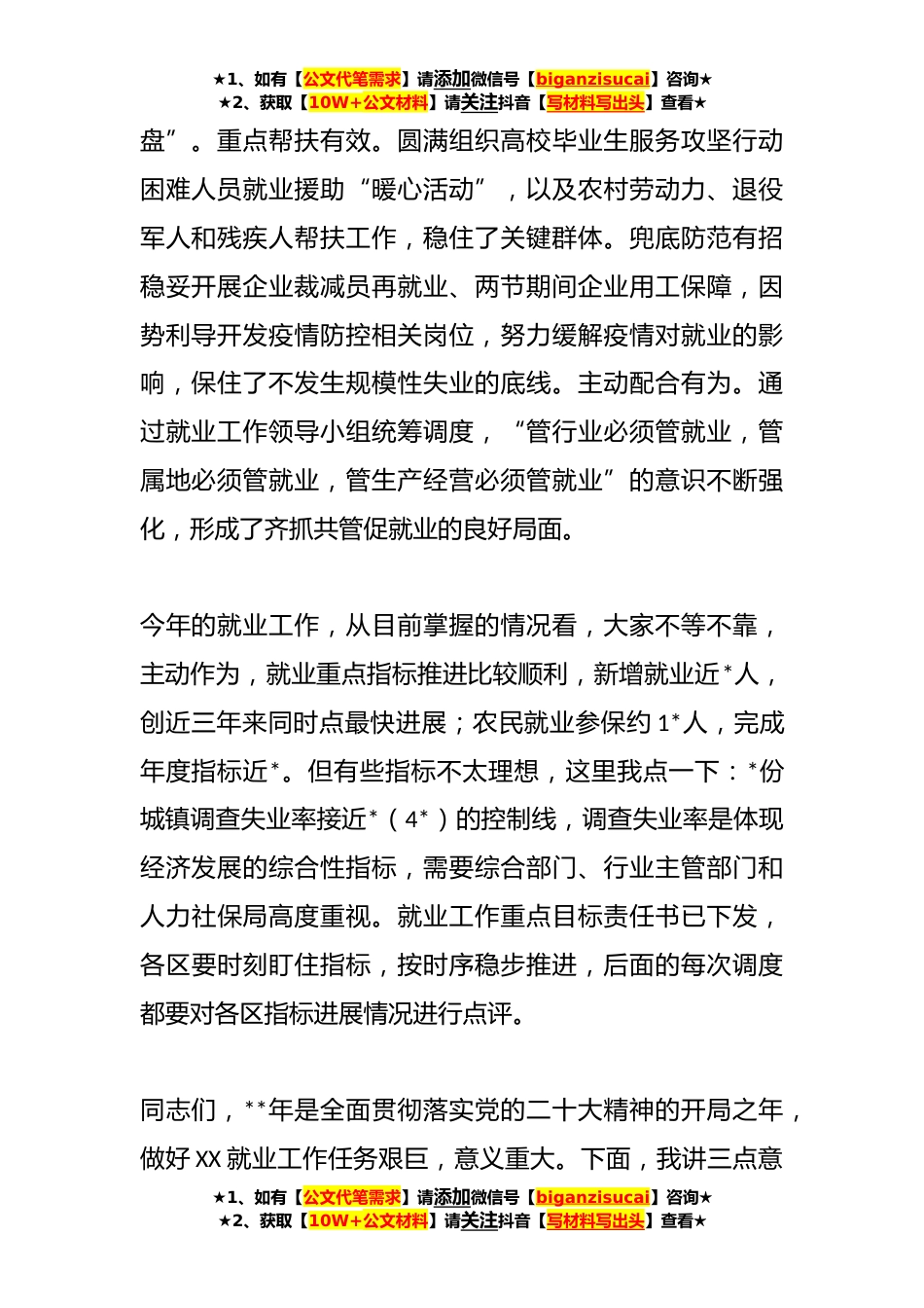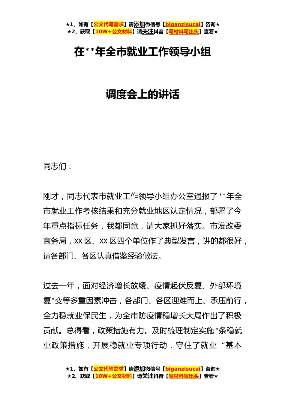 ★1、如有【公文代笔需求】请添加微信号【biganzisucai】咨询★★2、获取【10W+公文材料】请关注抖音【写材料写出头】查看★在**年全市就业工作领导小组调度会上的讲话同志们:刚才,同志代表市就业工作领导小组办公室通报了**年全市就业工作考核结果和充分就业地区认定情况,部署了今年重点指标任务,我都同意,请大家抓好落实。市发改委商务局,XX区、XX区四个单位作了典型发言,讲的都很好,请各部门、各区认真借鉴经验做法。过去一年,面对经济增长放缓、疫情起伏反复、外部环境复*变等多重因素冲击,各部门、各区迎难而上、承压前行,全力稳就业保民生,为全市防疫情稳增长大局作出了积极贡献。总得看,政策措施有力。及时梳理制定实施*条稳就业政策措施,开展稳就业专项行动,守住了就业“基本★1、如有【公...