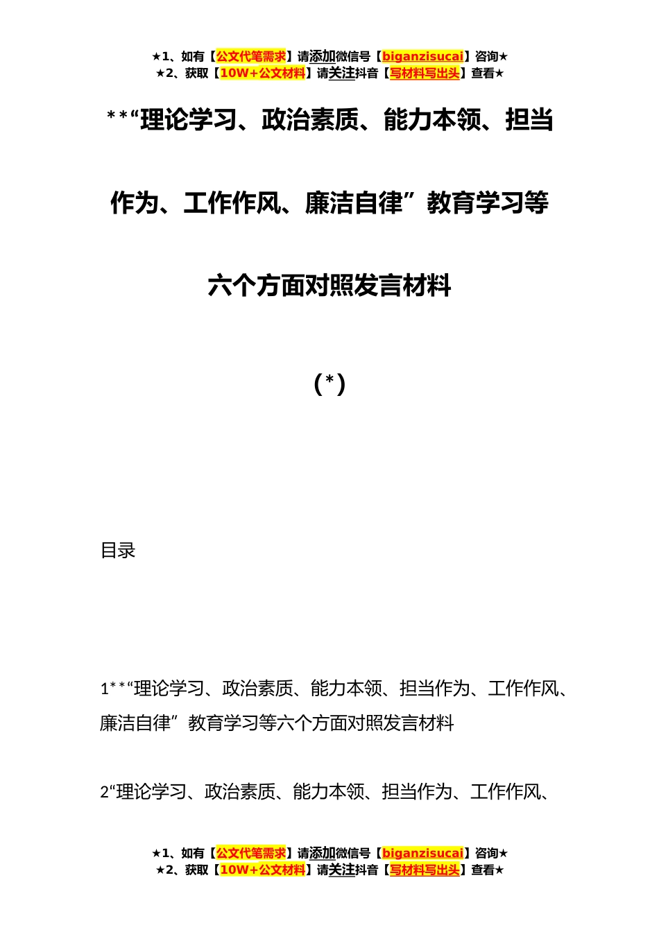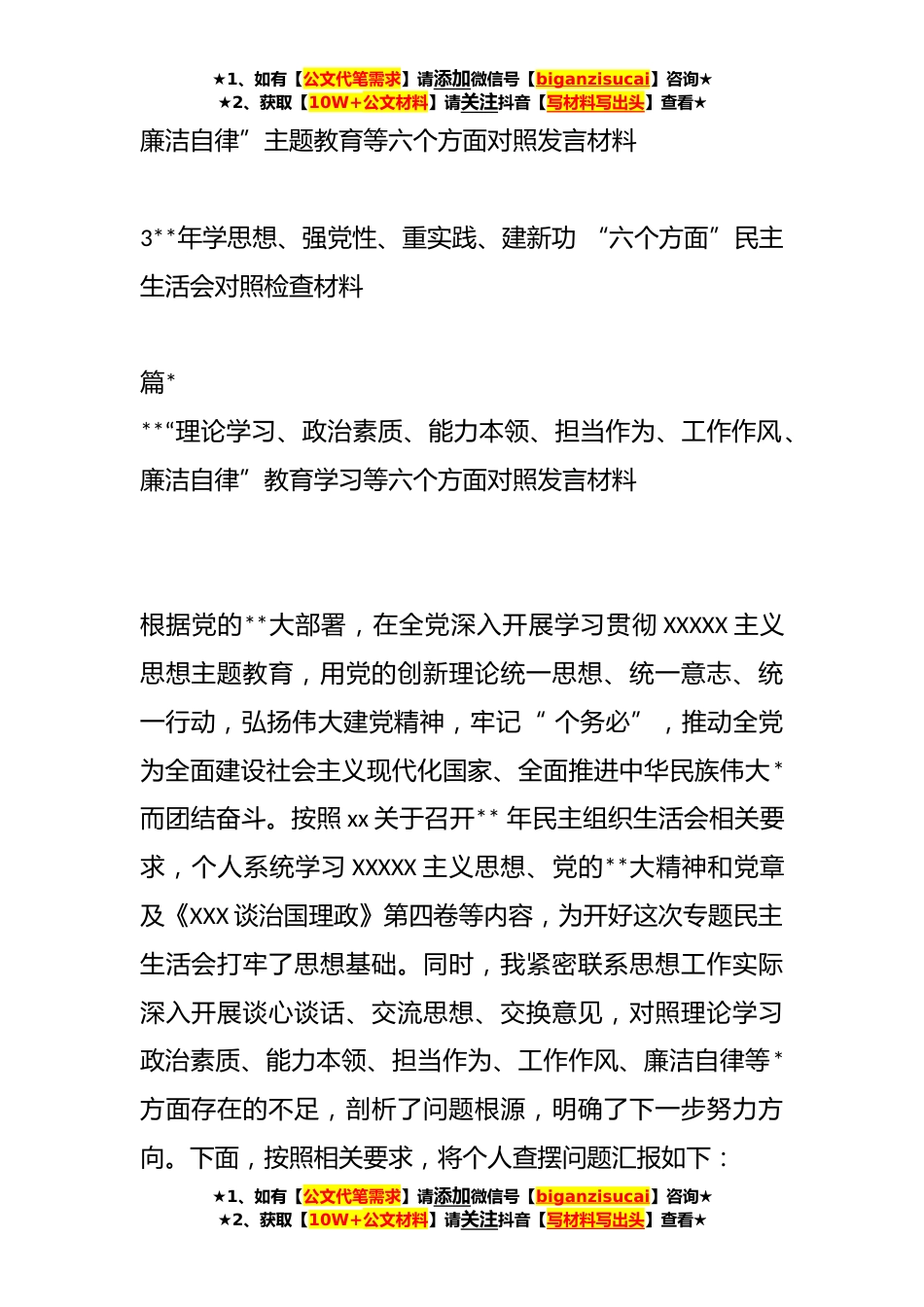★1、如有【公文代笔需求】请添加微信号【biganzisucai】咨询★★2、获取【10W+公文材料】请关注抖音【写材料写出头】查看★**“理论学习、政治素质、能力本领、担当作为、工作作风、廉洁自律”教育学习等六个方面对照发言材料(*)目录1**“理论学习、政治素质、能力本领、担当作为、工作作风、廉洁自律”教育学习等六个方面对照发言材料2“理论学习、政治素质、能力本领、担当作为、工作作风、★1、如有【公文代笔需求】请添加微信号【biganzisucai】咨询★★2、获取【10W+公文材料】请关注抖音【写材料写出头】查看★★1、如有【公文代笔需求】请添加微信号【biganzisucai】咨询★★2、获取【10W+公文材料】请关注抖音【写材料写出头】查看★廉洁自律”主题教育等六个方面对照发言材料3**年学思想、强党性、重...