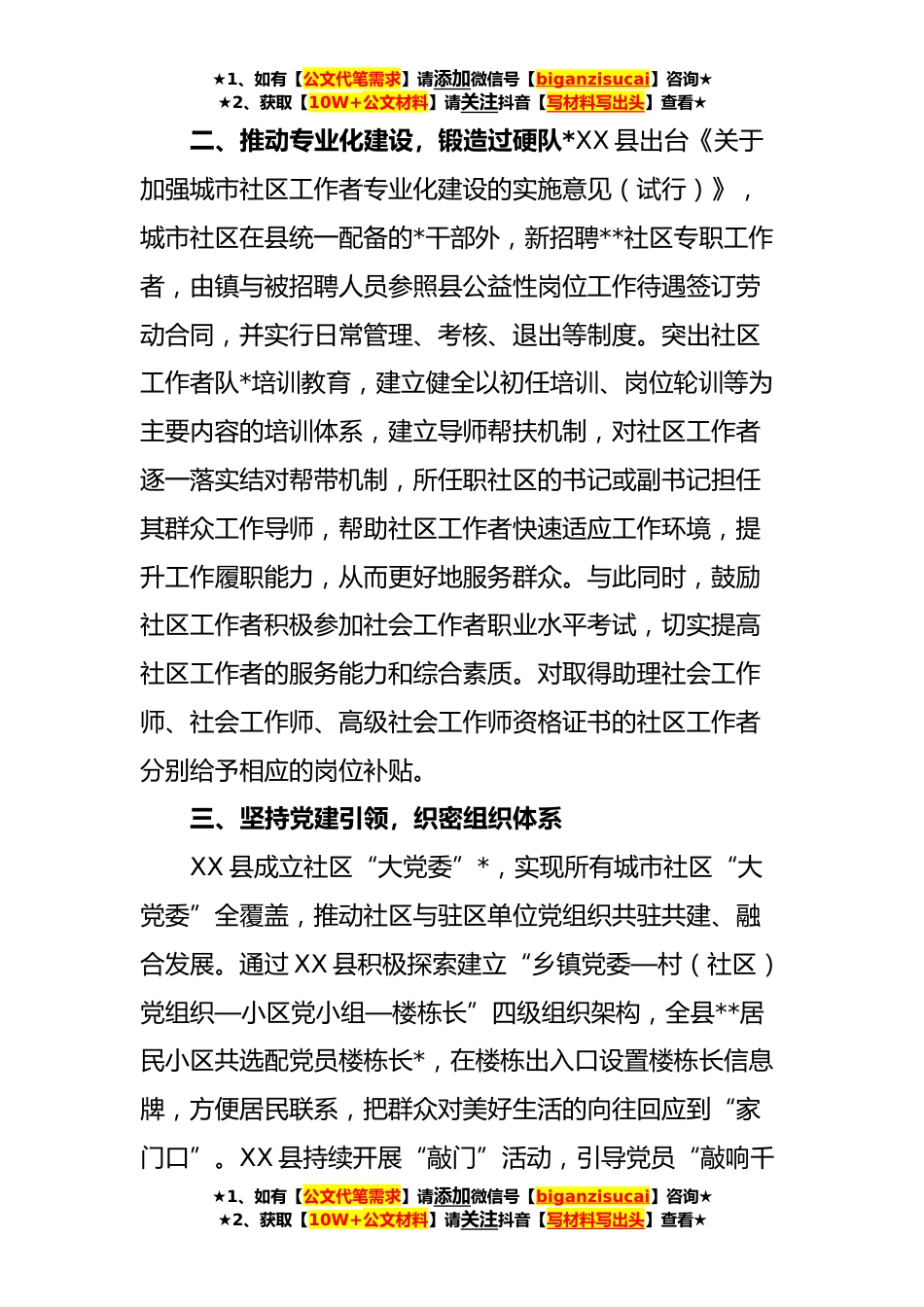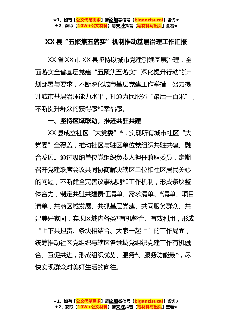 ★1、如有【公文代笔需求】请添加微信号【biganzisucai】咨询★★2、获取【10W+公文材料】请关注抖音【写材料写出头】查看★XX县“五聚焦五落实”机制推动基层治理工作汇报XX省XX市XX县坚持以城市党建引领基层治理,全面落实全省基层党建“五聚焦五落实”深化提升行动的计划部署与要求,不断深化城市基层党建工作举措,努力提升城市基层治理能力水平,打通为民服务“最后一百米”,不断提升群众的获得感和幸福感。一、坚持区域联动,推进共驻共建XX县成立社区“大党委”*,实现所有城市社区“大党委”全覆盖,推动社区与驻区单位党组织共驻共建、融合发展。通过吸纳单位党组织负责人担任兼职委员,定期召开党建联席会议共同协商解决辖区单位和社区居民关心的问题,不断健全完善议事规则和工作机制,形成条块整体合...