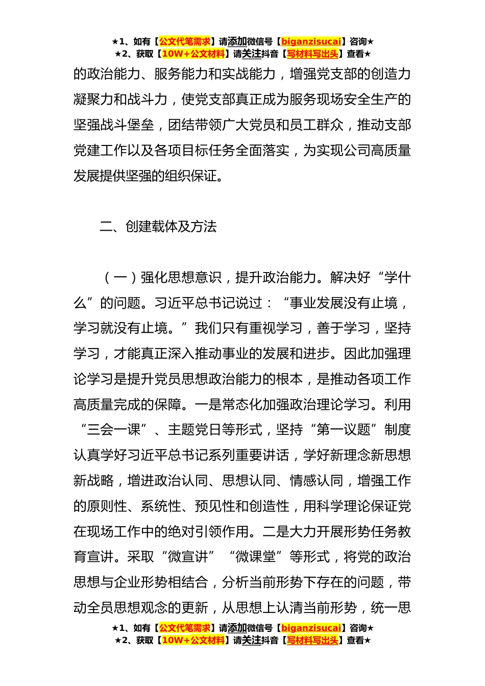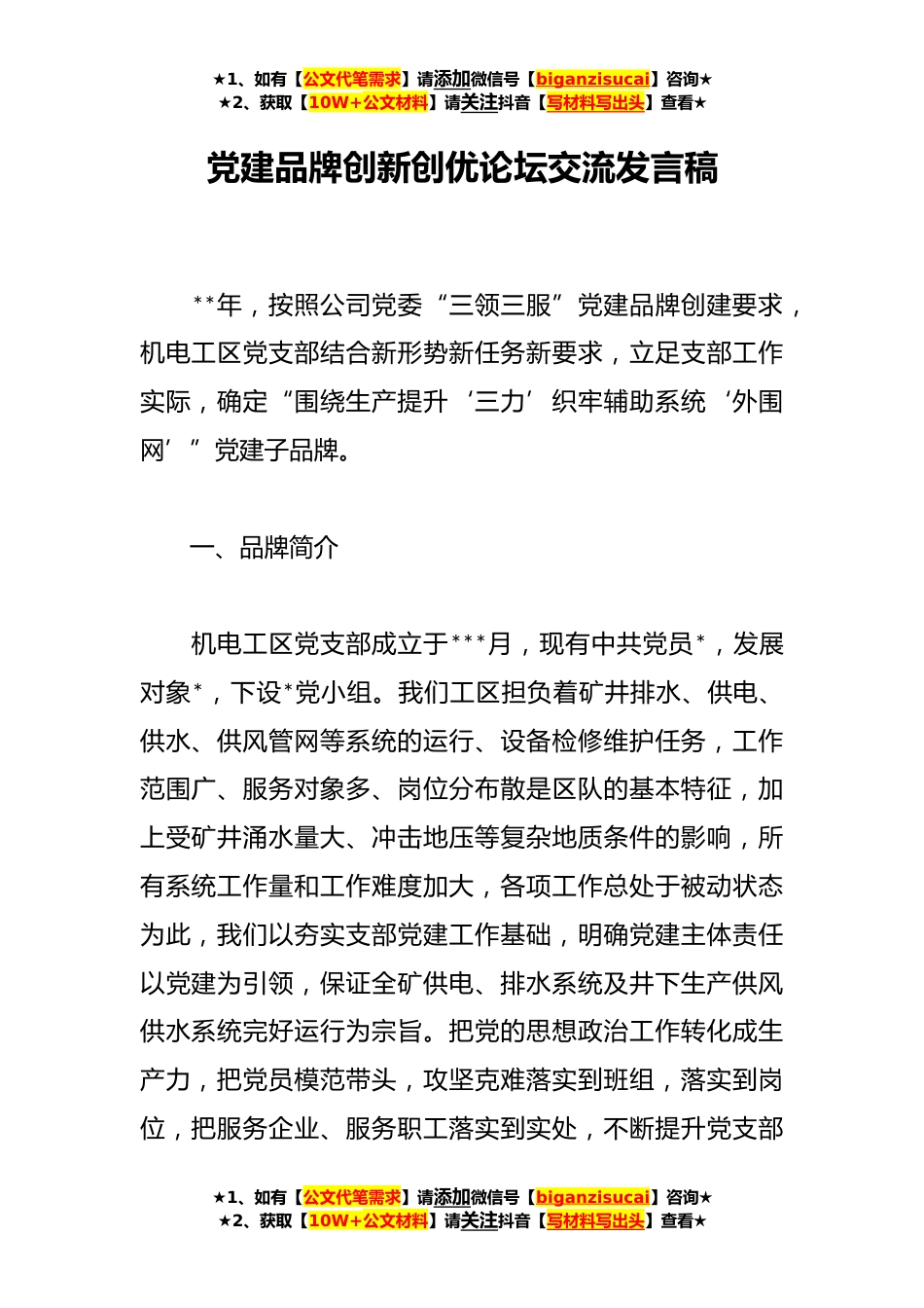 ★1、如有【公文代笔需求】请添加微信号【biganzisucai】咨询★★2、获取【10W+公文材料】请关注抖音【写材料写出头】查看★党建品牌创新创优论坛交流发言稿**年,按照公司党委“三领三服”党建品牌创建要求,机电工区党支部结合新形势新任务新要求,立足支部工作实际,确定“围绕生产提升‘三力’织牢辅助系统‘外围网’”党建子品牌。一、品牌简介机电工区党支部成立于***月,现有中共党员*,发展对象*,下设*党小组。我们工区担负着矿井排水、供电、供水、供风管网等系统的运行、设备检修维护任务,工作范围广、服务对象多、岗位分布散是区队的基本特征,加上受矿井涌水量大、冲击地压等复杂地质条件的影响,所有系统工作量和工作难度加大,各项工作总处于被动状态为此,我们以夯实支部党建工作基础,明确党建...