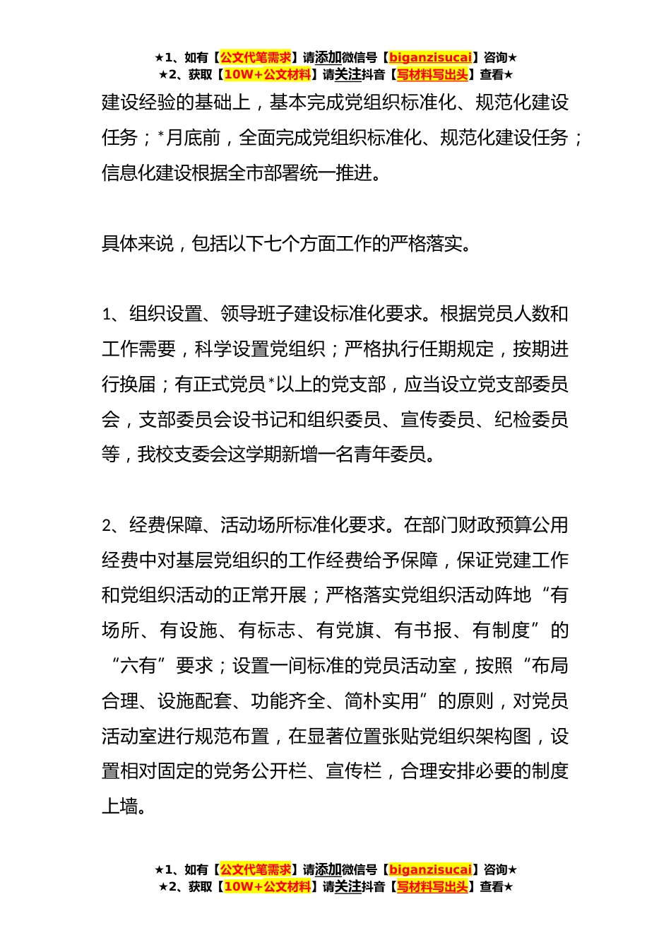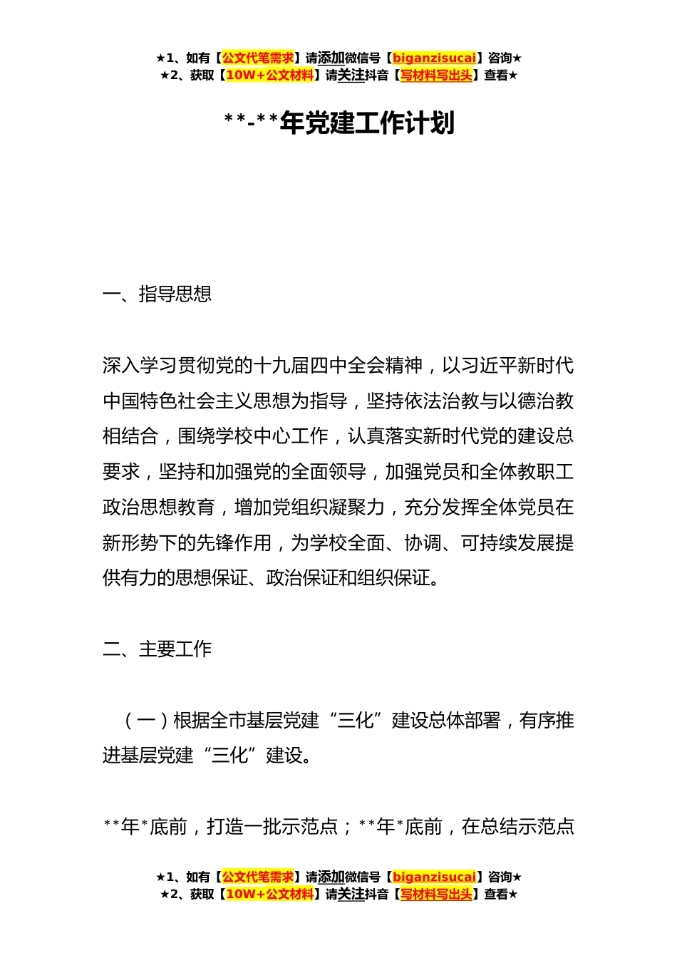 ★1、如有【公文代笔需求】请添加微信号【biganzisucai】咨询★★2、获取【10W+公文材料】请关注抖音【写材料写出头】查看★**-**年党建工作计划一、指导思想深入学习贯彻党的十九届四中全会精神,以习近平新时代中国特色社会主义思想为指导,坚持依法治教与以德治教相结合,围绕学校中心工作,认真落实新时代党的建设总要求,坚持和加强党的全面领导,加强党员和全体教职工政治思想教育,增加党组织凝聚力,充分发挥全体党员在新形势下的先锋作用,为学校全面、协调、可持续发展提供有力的思想保证、政治保证和组织保证。二、主要工作(一)根据全市基层党建“三化”建设总体部署,有序推进基层党建“三化”建设。**年*底前,打造一批示范点;**年*底前,在总结示范点★1、如有【公文代笔需求】请添加微信号【big...