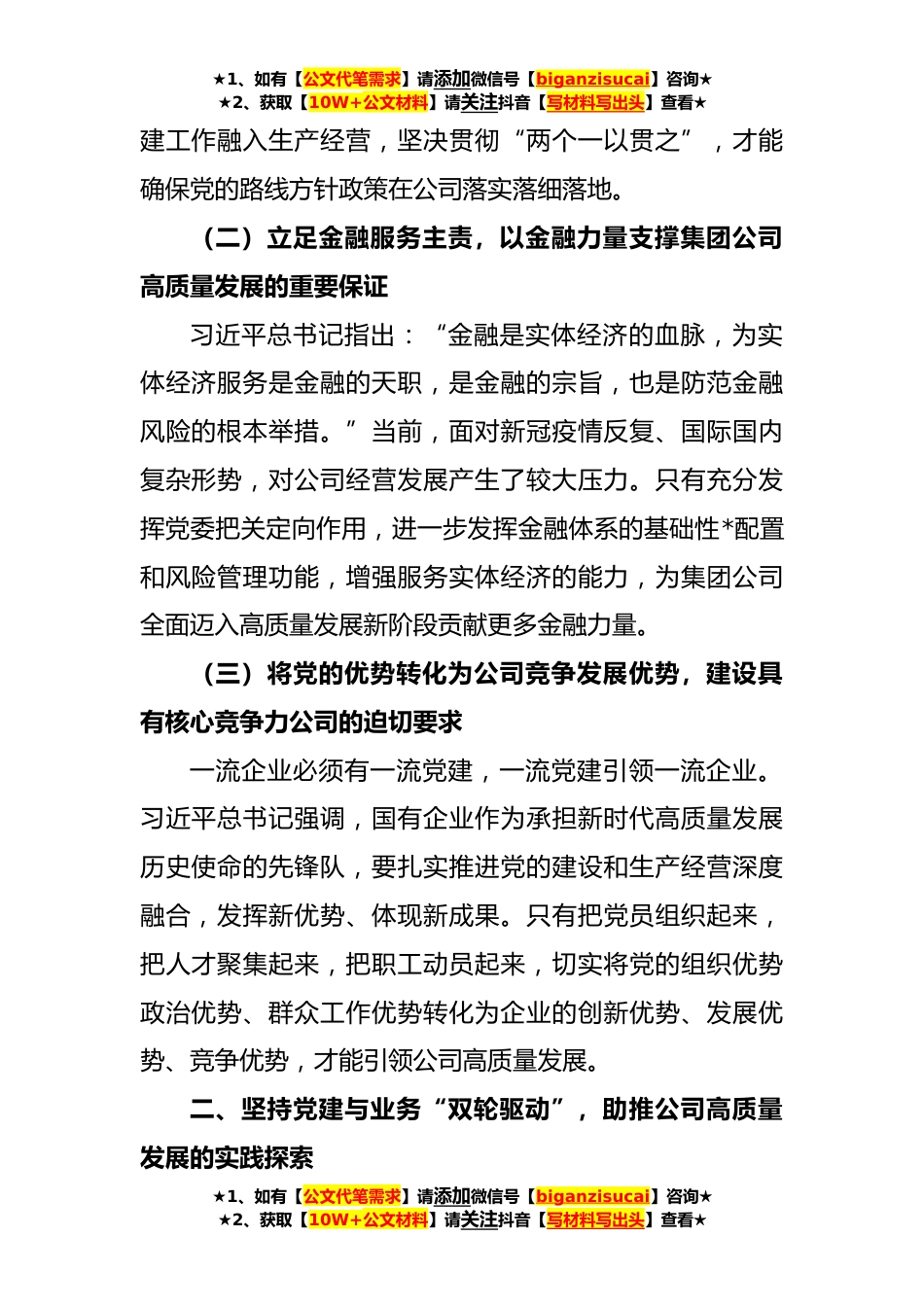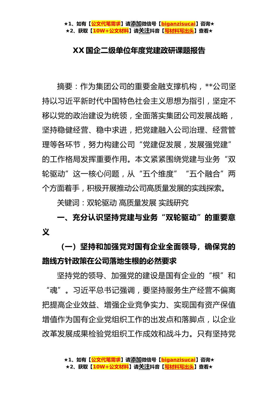 ★1、如有【公文代笔需求】请添加微信号【biganzisucai】咨询★★2、获取【10W+公文材料】请关注抖音【写材料写出头】查看★XX国企二级单位年度党建政研课题报告摘要:作为集团公司的重要金融支撑机构,**公司坚持以习近平新时代中国特色社会主义思想为指引,坚定不移以党的政治建设为统领,全面落实集团公司发展战略,坚持稳健经营、稳中求进,把党建融入公司治理、经营管理等各环节,努力构建公司“党建促发展,发展强党建”的工作格局发挥重要作用。本文紧紧围绕党建与业务“双轮驱动”这一核心问题,从“五个维度”“五个融合”两个方面着手,积极开展推动公司高质量发展的实践探索。关键词:双轮驱动高质量发展实践研究一、充分认识坚持党建与业务“双轮驱动”的重要意义(一)坚持和加强党对国有企业全面领...