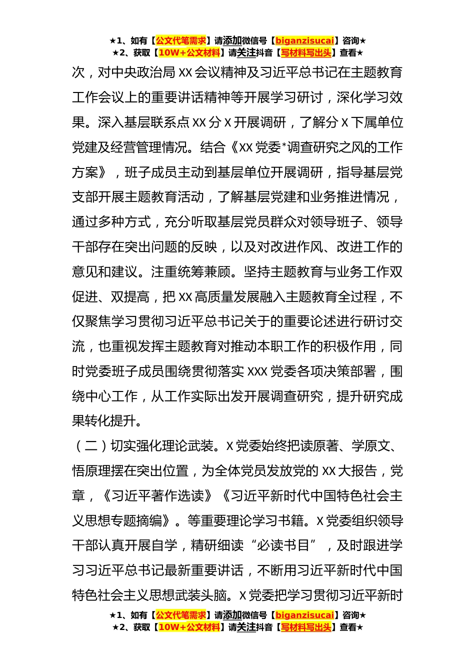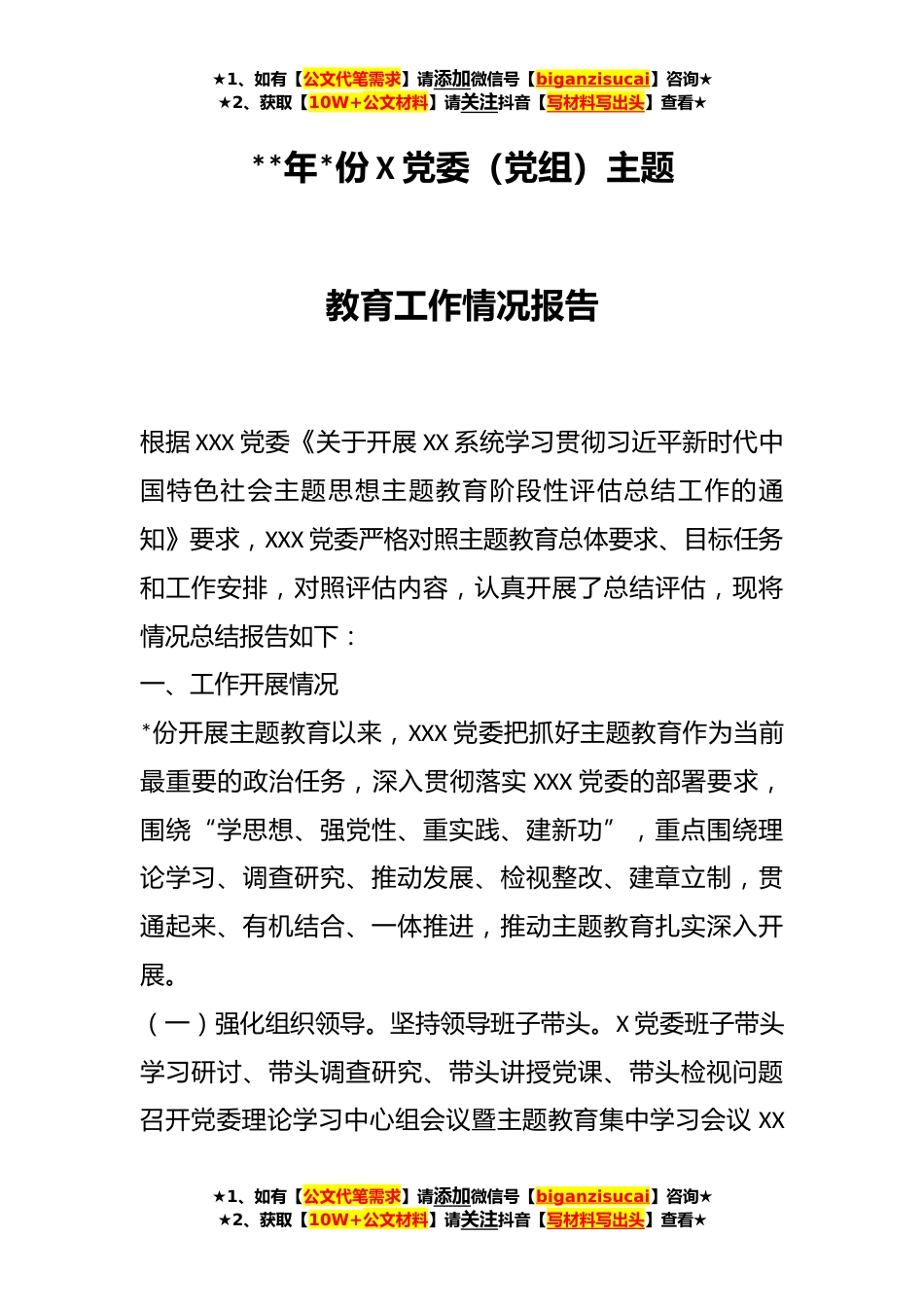 ★1、如有【公文代笔需求】请添加微信号【biganzisucai】咨询★★2、获取【10W+公文材料】请关注抖音【写材料写出头】查看★**年*份X党委(党组)主题教育工作情况报告根据XXX党委《关于开展XX系统学习贯彻习近平新时代中国特色社会主题思想主题教育阶段性评估总结工作的通知》要求,XXX党委严格对照主题教育总体要求、目标任务和工作安排,对照评估内容,认真开展了总结评估,现将情况总结报告如下:一、工作开展情况*份开展主题教育以来,XXX党委把抓好主题教育作为当前最重要的政治任务,深入贯彻落实XXX党委的部署要求,围绕“学思想、强党性、重实践、建新功”,重点围绕理论学习、调查研究、推动发展、检视整改、建章立制,贯通起来、有机结合、一体推进,推动主题教育扎实深入开展。(一)强化组织领导。坚...
