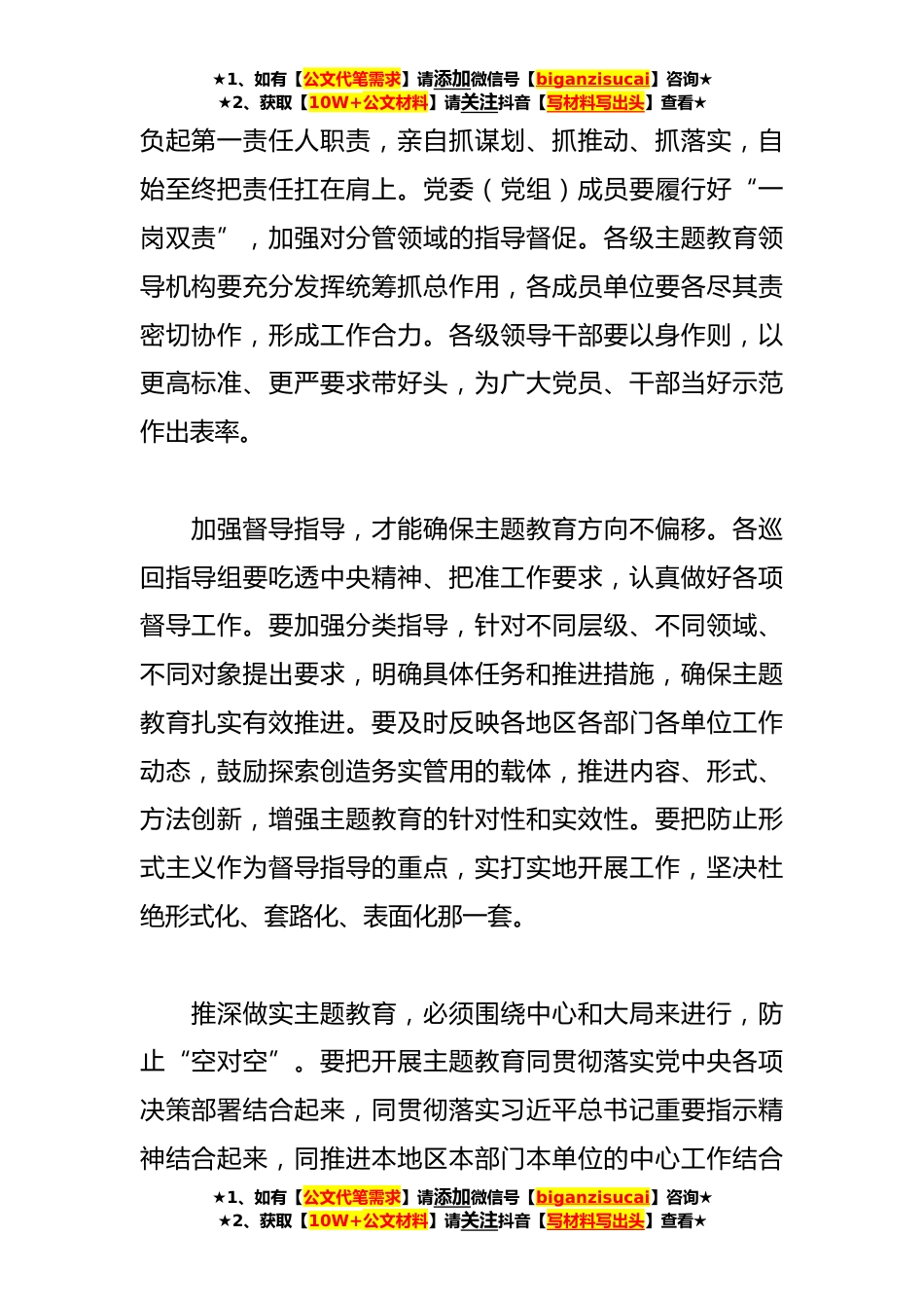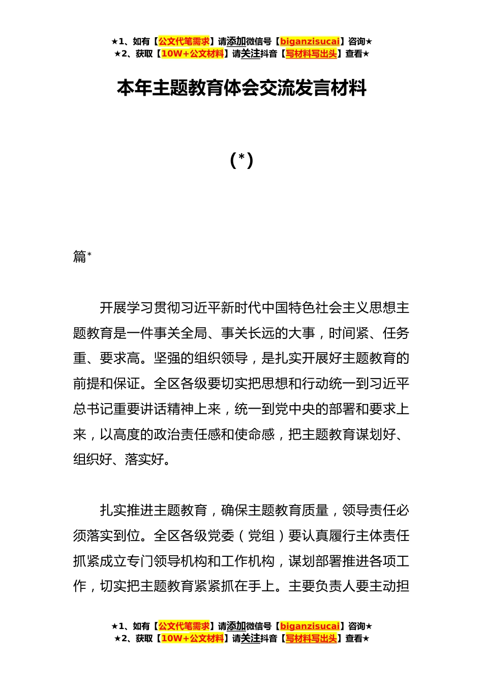 ★1、如有【公文代笔需求】请添加微信号【biganzisucai】咨询★★2、获取【10W+公文材料】请关注抖音【写材料写出头】查看★本年主题教育体会交流发言材料(*)篇*开展学习贯彻习近平新时代中国特色社会主义思想主题教育是一件事关全局、事关长远的大事,时间紧、任务重、要求高。坚强的组织领导,是扎实开展好主题教育的前提和保证。全区各级要切实把思想和行动统一到习近平总书记重要讲话精神上来,统一到党中央的部署和要求上来,以高度的政治责任感和使命感,把主题教育谋划好、组织好、落实好。扎实推进主题教育,确保主题教育质量,领导责任必须落实到位。全区各级党委(党组)要认真履行主体责任抓紧成立专门领导机构和工作机构,谋划部署推进各项工作,切实把主题教育紧紧抓在手上。主要负责人要主动担★1...