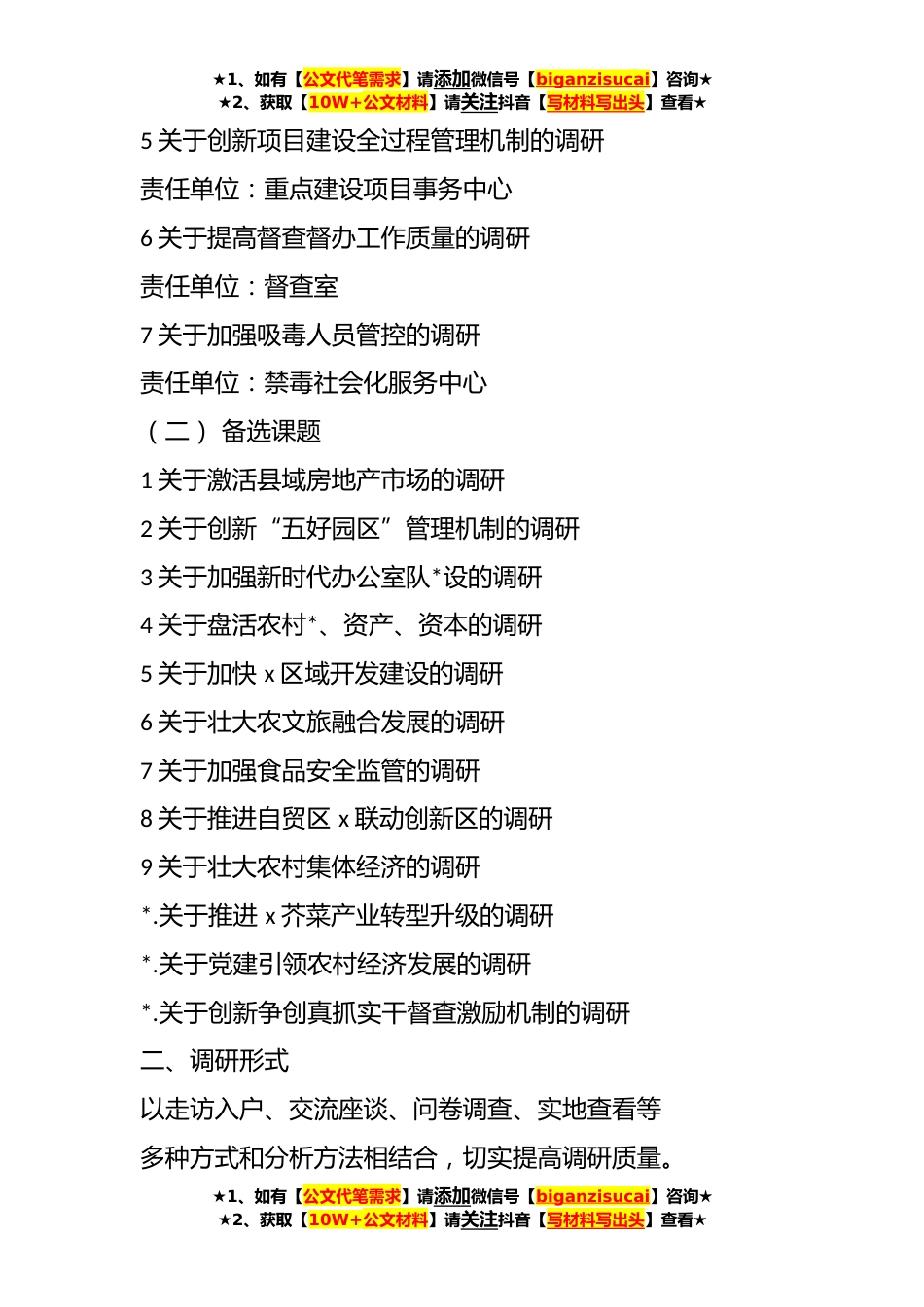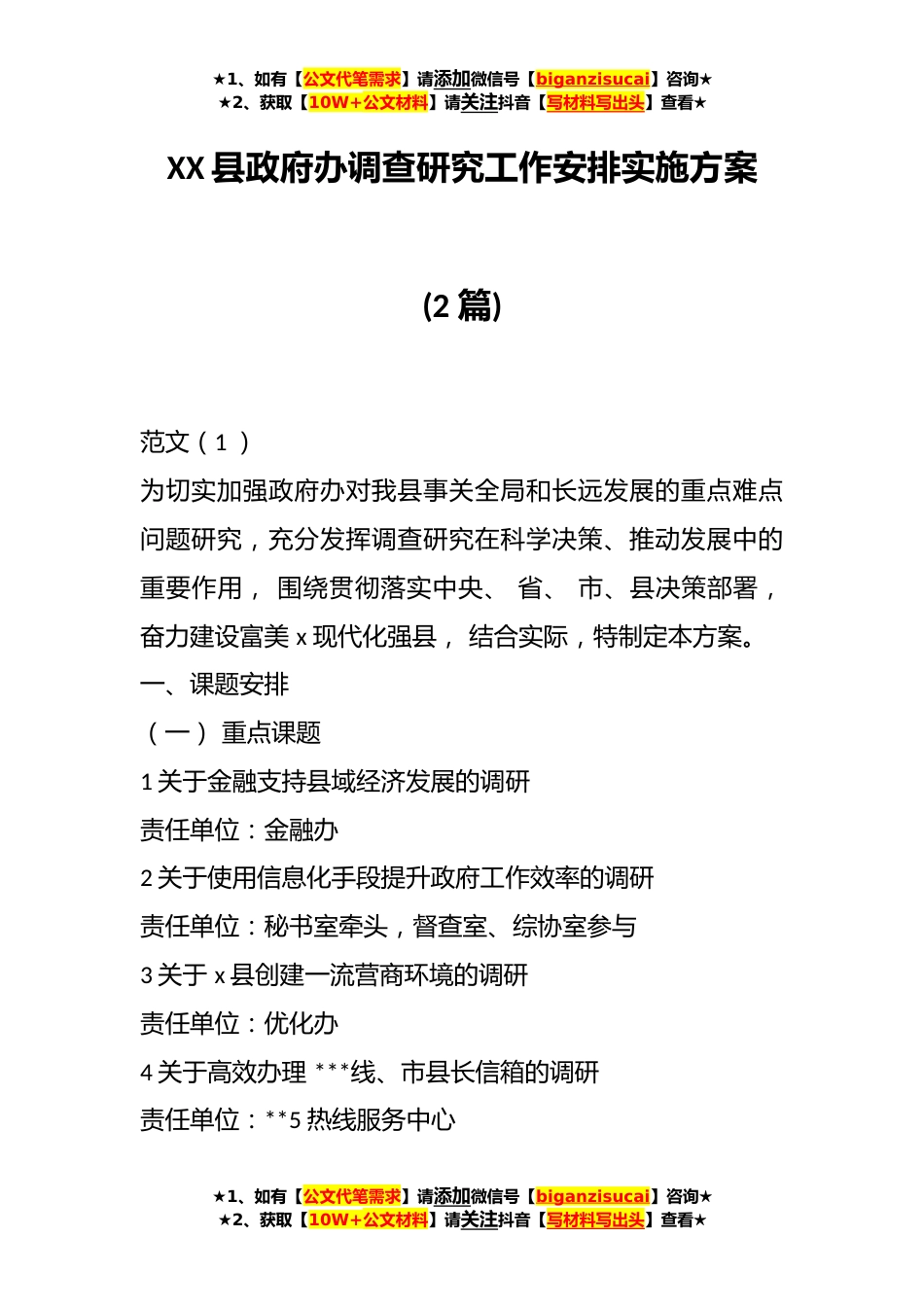 ★1、如有【公文代笔需求】请添加微信号【biganzisucai】咨询★★2、获取【10W+公文材料】请关注抖音【写材料写出头】查看★XX县政府办调查研究工作安排实施方案(2篇)范文(1)为切实加强政府办对我县事关全局和长远发展的重点难点问题研究,充分发挥调查研究在科学决策、推动发展中的重要作用,围绕贯彻落实中央、省、市、县决策部署,奋力建设富美x现代化强县,结合实际,特制定本方案。一、课题安排(一)重点课题1关于金融支持县域经济发展的调研责任单位:金融办2关于使用信息化手段提升政府工作效率的调研责任单位:秘书室牵头,督查室、综协室参与3关于x县创建一流营商环境的调研责任单位:优化办4关于高效办理***线、市县长信箱的调研责任单位:**5热线服务中心★1、如有【公文代笔需求】请添加微信号【bi...