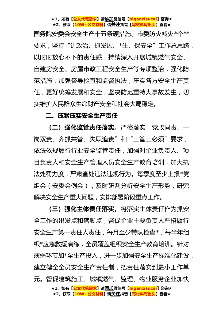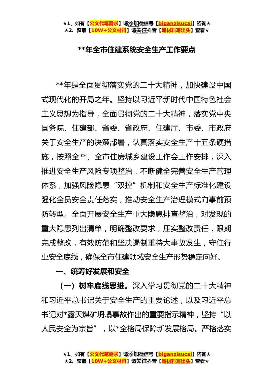 ★1、如有【公文代笔需求】请添加微信号【biganzisucai】咨询★★2、获取【10W+公文材料】请关注抖音【写材料写出头】查看★**年全市住建系统安全生产工作要点**年是全面贯彻落实党的二十大精神,加快建设中国式现代化的开局之年。坚持以习近平新时代中国特色社会主义思想为指导,全面贯彻党的二十大精神,落实党中央国务院、住建部、省委、省政府、住建厅、市委、市政府关于安全生产的决策部署,认真落实安全生产十五条硬措施,按照全**、全市住房城乡建设工作会工作安排,深入推进安全生产风险专项整治,不断健全完善安全生产管理体系,加强风险隐患“双控”机制和安全生产标准化建设强化全员安全责任落实,推动安全生产治理模式向事前预防转型。全面开展安全生产重大隐患排查整治,对发现的重大隐患列出清单,...
