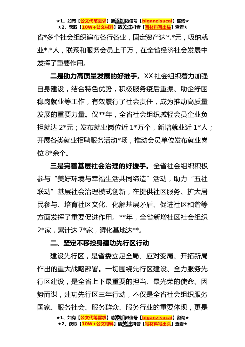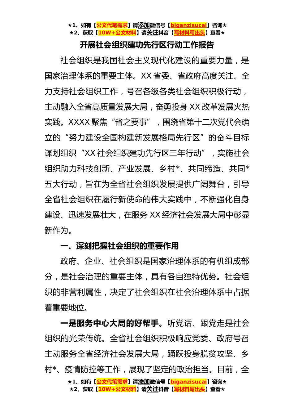 ★1、如有【公文代笔需求】请添加微信号【biganzisucai】咨询★★2、获取【10W+公文材料】请关注抖音【写材料写出头】查看★开展社会组织建功先行区行动工作报告社会组织是我国社会主义现代化建设的重要力量,是国家治理体系的重要主体。XX省委、省政府高度关注、全力支持社会组织工作,号召各级各类社会组织积极行动,主动融入全省高质量发展大局,奋勇投身XX改革发展火热实践。XXXX聚焦“省之要事”,围绕省第十二次党代会确立的“努力建设全国构建新发展格局先行区”的奋斗目标谋划组织“XX社会组织建功先行区三年行动”,实施社会组织助力科技创新、产业发展、乡村*、共同缔造、共同*五大行动,旨在为全省社会组织发展提供广阔舞台,引导全省社会组织在履行新使命的伟大实践中,不断强化自身建设、迅速发展壮...