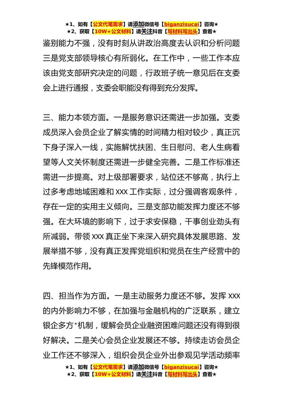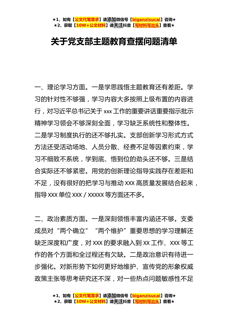 ★1、如有【公文代笔需求】请添加微信号【biganzisucai】咨询★★2、获取【10W+公文材料】请关注抖音【写材料写出头】查看★关于党支部主题教育查摆问题清单一、理论学习方面。一是学思践悟主题教育还有差距。学习的针对性不够强,学习内容大多按照上级布置的内容进行,对习近平总书记关于xxx工作的重要讲话重要指示批示精神学习领会不够深刻全面,学习缺乏系统性和整体性。二是学习制度执行的还不够扎实。支部创新学习形式方式方法还受活动场地、人员分散、经费不足等因素约束,学习不细致不系统,学到底、悟到位的劲头还不够。三是结合实际还不够紧密。用党的创新理论指导实践存在差距和不足,没有很好的把学习与推动XXX高质量发展结合起来,指导XXX单位XXX/XXXXX等方面还不多。二、政治素质方面。一是深刻领悟...