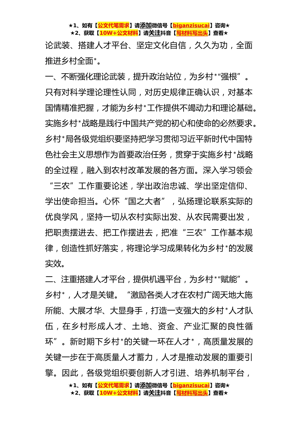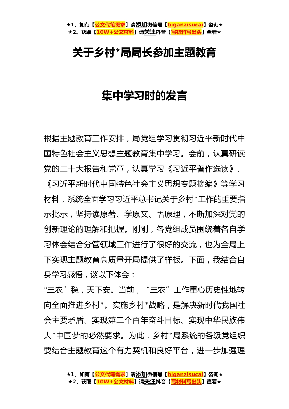 ★1、如有【公文代笔需求】请添加微信号【biganzisucai】咨询★★2、获取【10W+公文材料】请关注抖音【写材料写出头】查看★关于乡村*局局长参加主题教育集中学习时的发言根据主题教育工作安排,局党组学习贯彻习近平新时代中国特色社会主义思想主题教育集中学习。会前,认真研读党的二十大报告和党章,认真学习《习近平著作选读》、《习近平新时代中国特色社会主义思想专题摘编》等学习材料,系统全面学习习近平总书记关于乡村*工作的重要指示批示,坚持读原著、学原文、悟原理,不断加深对党的创新理论的理解和把握。刚刚,各党组成员围绕着各自学习体会结合分管领域工作进行了很好的交流,也为全局上下实现主题教育高质量开局提供了样板。下面,我结合自身学习感悟,谈以下体会:“三农”稳,天下安。当前,“...