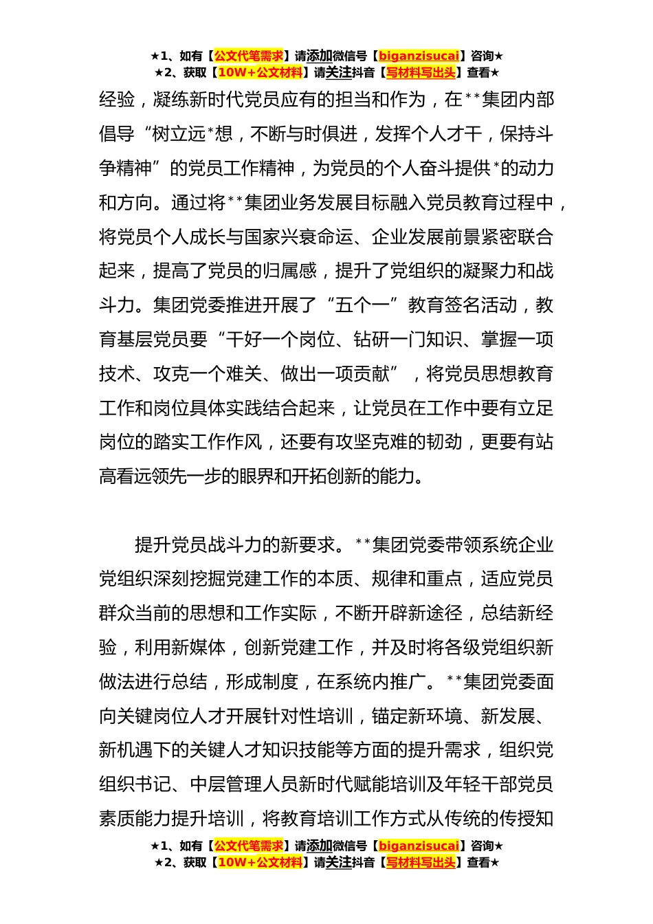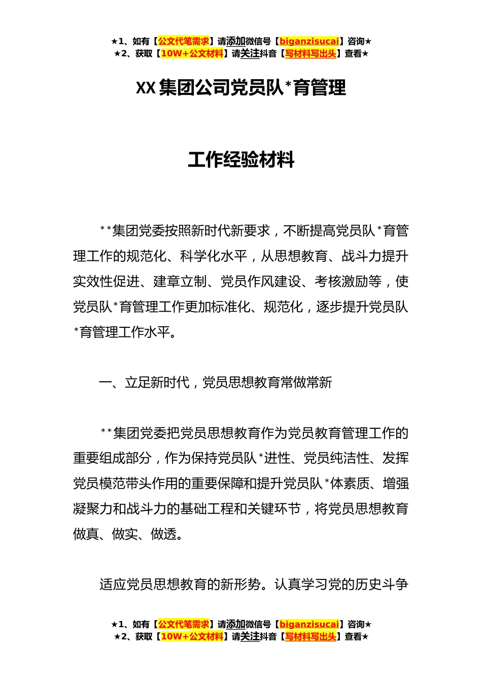 ★1、如有【公文代笔需求】请添加微信号【biganzisucai】咨询★★2、获取【10W+公文材料】请关注抖音【写材料写出头】查看★XX集团公司党员队*育管理工作经验材料**集团党委按照新时代新要求,不断提高党员队*育管理工作的规范化、科学化水平,从思想教育、战斗力提升实效性促进、建章立制、党员作风建设、考核激励等,使党员队*育管理工作更加标准化、规范化,逐步提升党员队*育管理工作水平。一、立足新时代,党员思想教育常做常新**集团党委把党员思想教育作为党员教育管理工作的重要组成部分,作为保持党员队*进性、党员纯洁性、发挥党员模范带头作用的重要保障和提升党员队*体素质、增强凝聚力和战斗力的基础工程和关键环节,将党员思想教育做真、做实、做透。适应党员思想教育的新形势。认真学习党的历史斗...