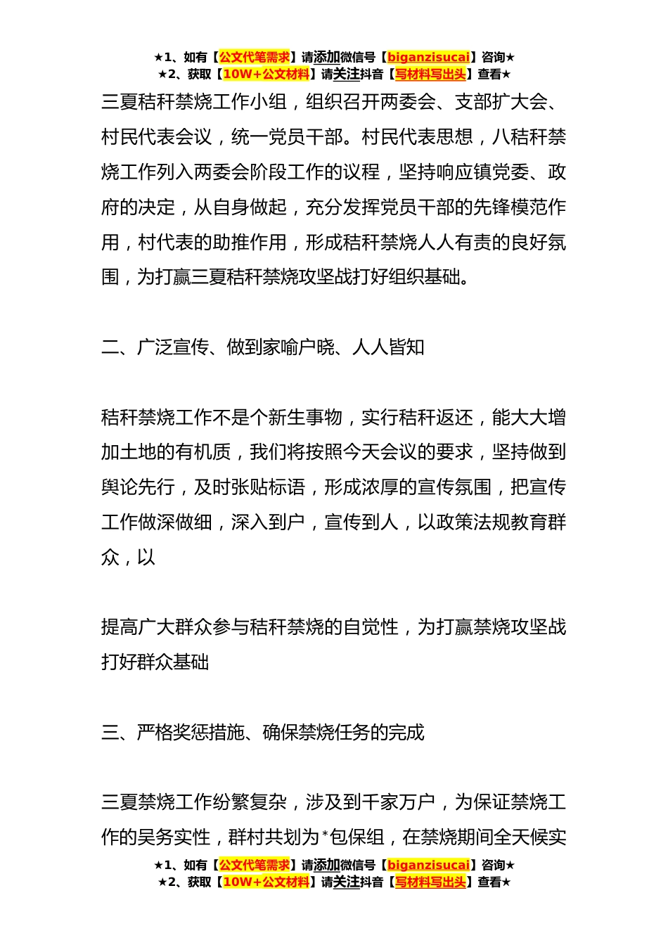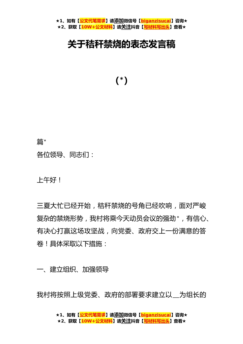 ★1、如有【公文代笔需求】请添加微信号【biganzisucai】咨询★★2、获取【10W+公文材料】请关注抖音【写材料写出头】查看★关于秸秆禁烧的表态发言稿(*)篇*各位领导、同志们:上午好!三夏大忙已经开始,秸秆禁烧的号角已经吹响,面对严峻复杂的禁烧形势,我村将乘今天动员会议的强劲*,有信心、有决心打赢这场攻坚战,向党委、政府交上一份满意的答卷!具体采取以下措施:一、建立组织、加强领导我村将按照上级党委、政府的部署要求建立以__为组长的★1、如有【公文代笔需求】请添加微信号【biganzisucai】咨询★★2、获取【10W+公文材料】请关注抖音【写材料写出头】查看★★1、如有【公文代笔需求】请添加微信号【biganzisucai】咨询★★2、获取【10W+公文材料】请关注抖音【写材料写出头】查看★三夏秸秆禁...