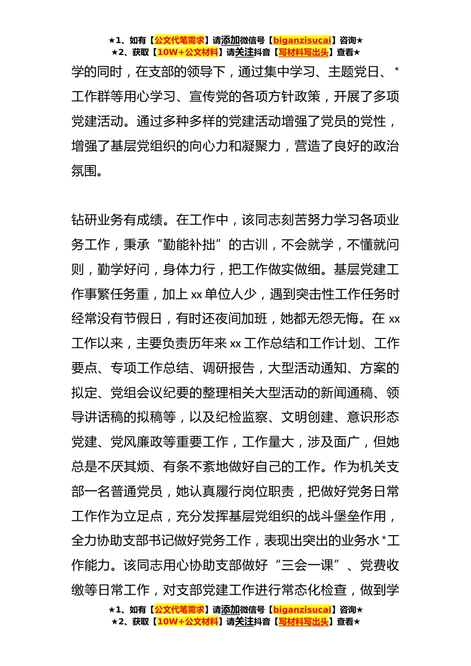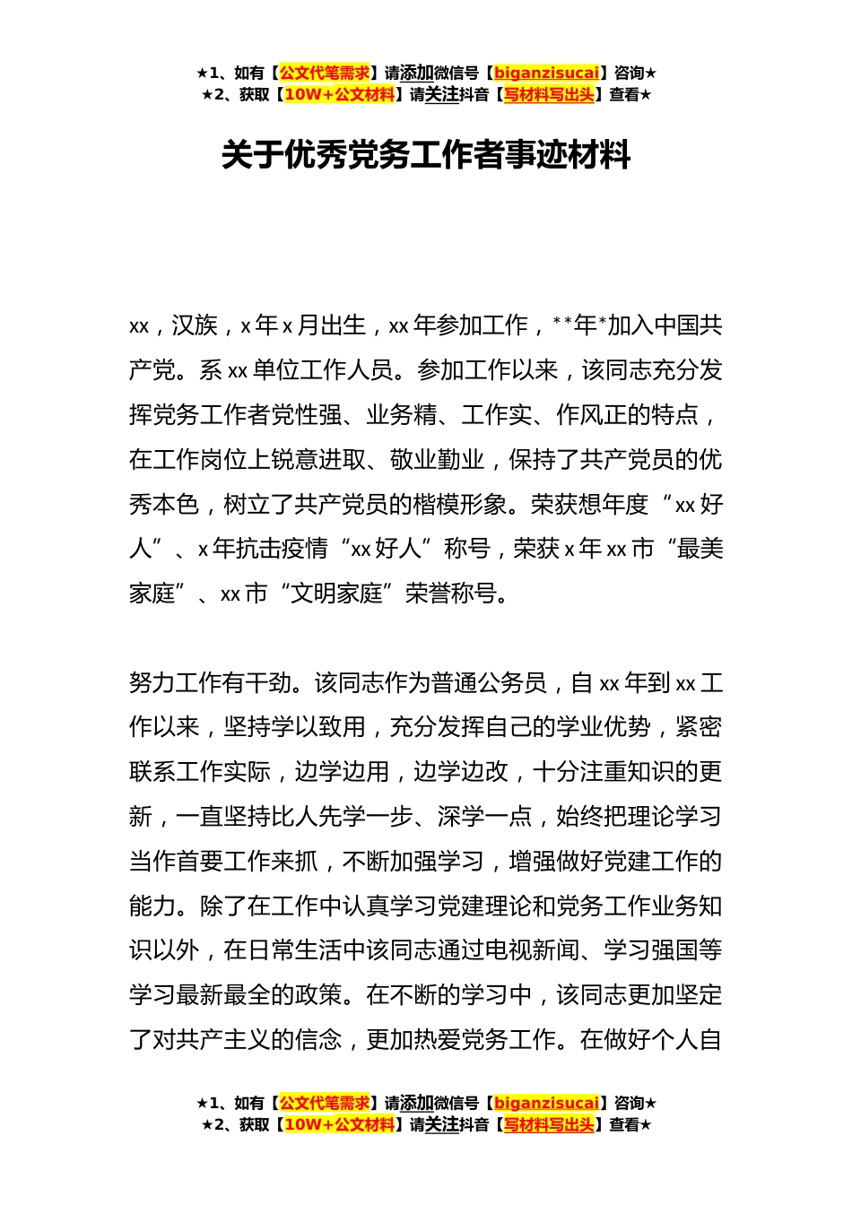★1、如有【公文代笔需求】请添加微信号【biganzisucai】咨询★★2、获取【10W+公文材料】请关注抖音【写材料写出头】查看★关于优秀党务工作者事迹材料xx,汉族,x年x月出生,xx年参加工作,**年*加入中国共产党。系xx单位工作人员。参加工作以来,该同志充分发挥党务工作者党性强、业务精、工作实、作风正的特点,在工作岗位上锐意进取、敬业勤业,保持了共产党员的优秀本色,树立了共产党员的楷模形象。荣获想年度“xx好人”、x年抗击疫情“xx好人”称号,荣获x年xx市“最美家庭”、xx市“文明家庭”荣誉称号。努力工作有干劲。该同志作为普通公务员,自xx年到xx工作以来,坚持学以致用,充分发挥自己的学业优势,紧密联系工作实际,边学边用,边学边改,十分注重知识的更新,一直坚持比人先学一步、深学一点,...