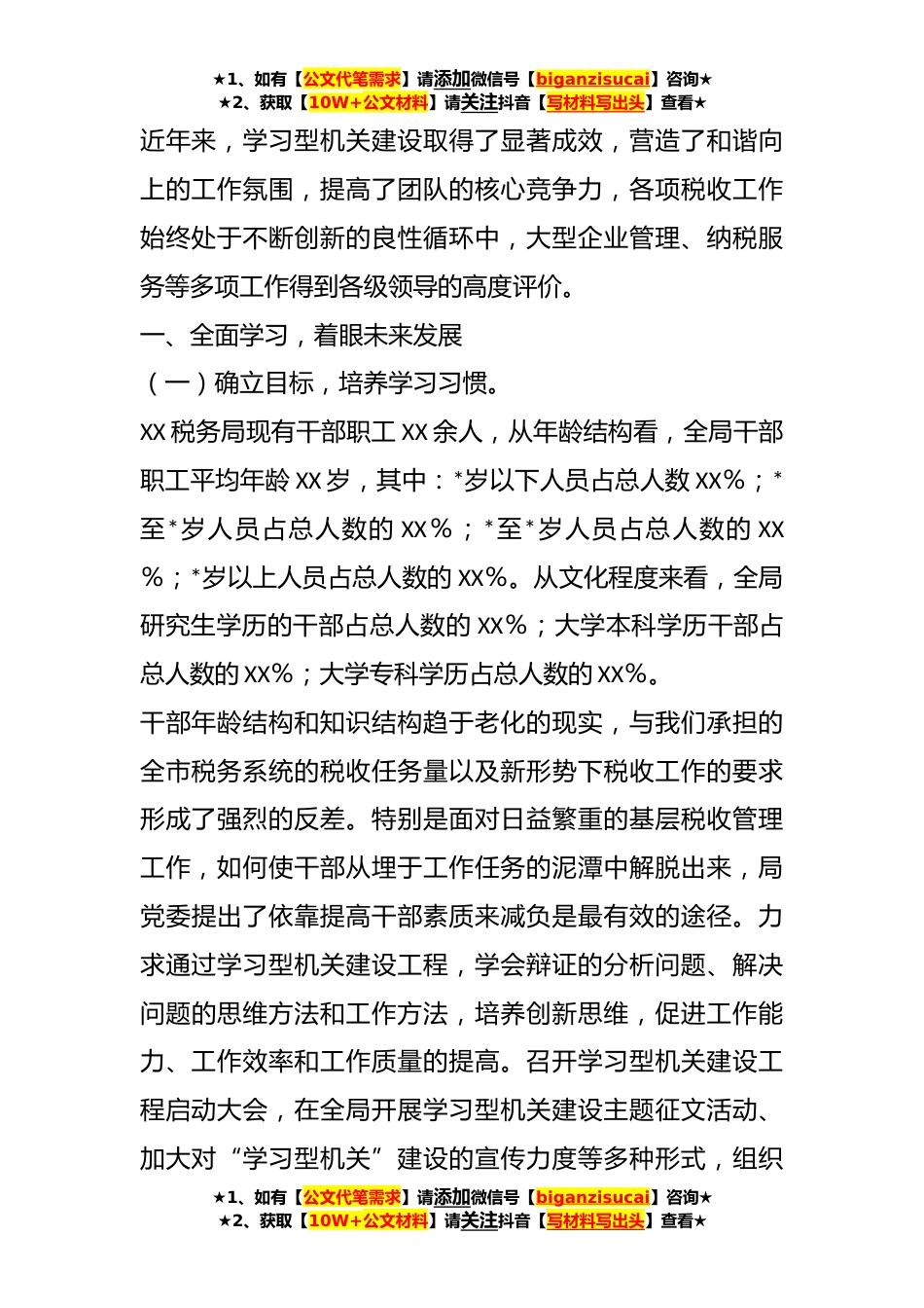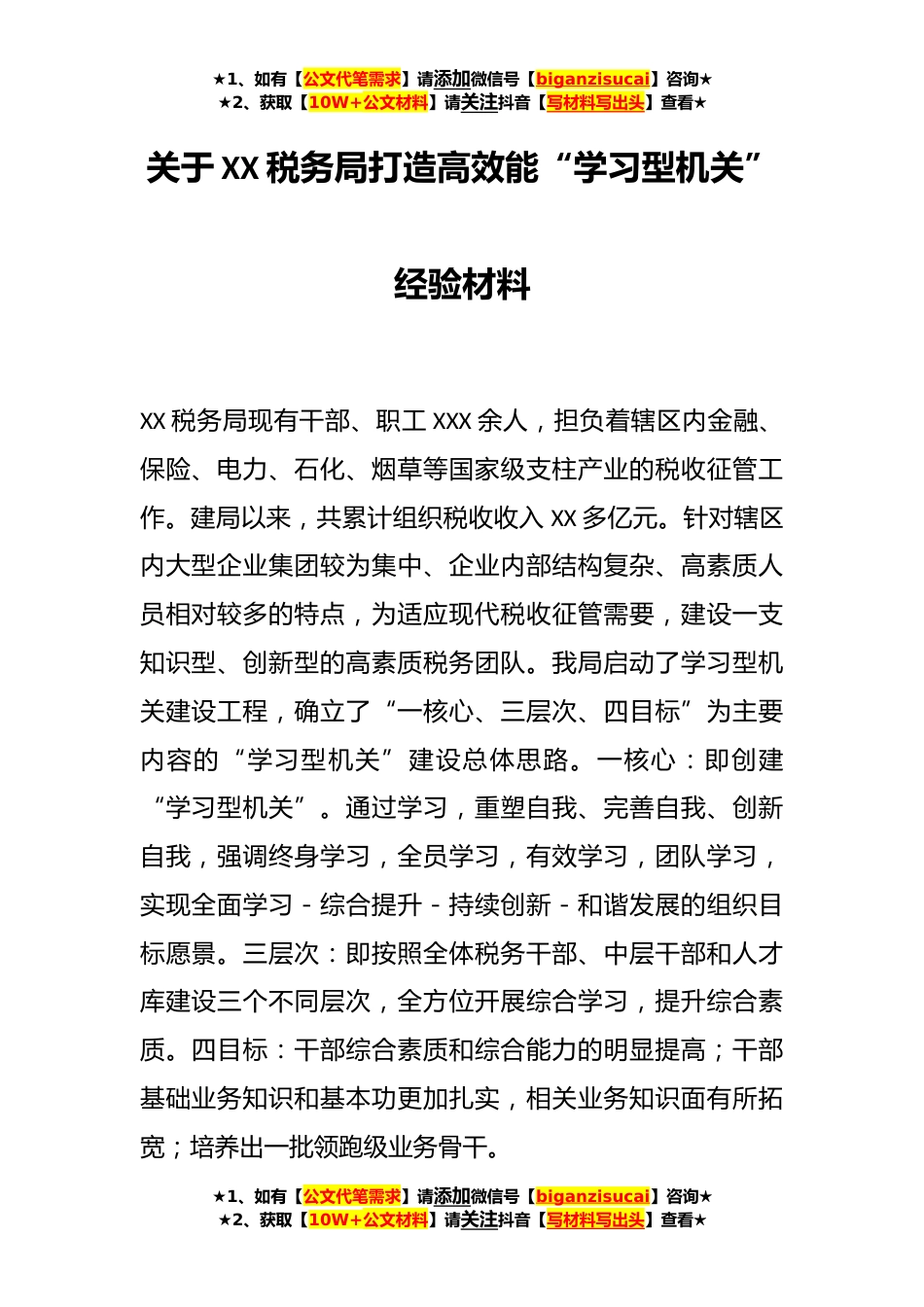 ★1、如有【公文代笔需求】请添加微信号【biganzisucai】咨询★★2、获取【10W+公文材料】请关注抖音【写材料写出头】查看★关于XX税务局打造高效能“学习型机关”经验材料XX税务局现有干部、职工XXX余人,担负着辖区内金融、保险、电力、石化、烟草等国家级支柱产业的税收征管工作。建局以来,共累计组织税收收入XX多亿元。针对辖区内大型企业集团较为集中、企业内部结构复杂、高素质人员相对较多的特点,为适应现代税收征管需要,建设一支知识型、创新型的高素质税务团队。我局启动了学习型机关建设工程,确立了“一核心、三层次、四目标”为主要内容的“学习型机关”建设总体思路。一核心:即创建“学习型机关”。通过学习,重塑自我、完善自我、创新自我,强调终身学习,全员学习,有效学习,团队学习,实现全...