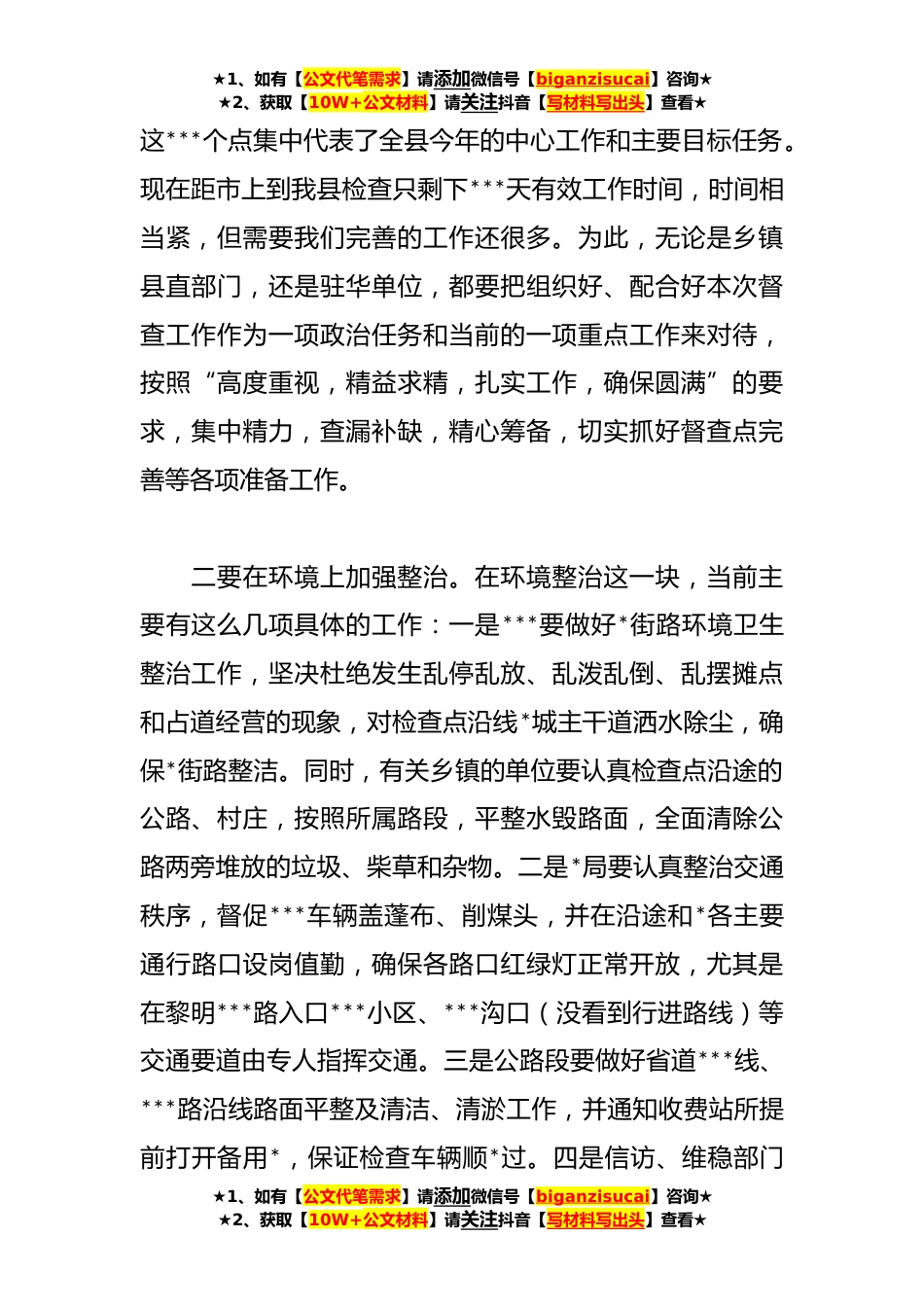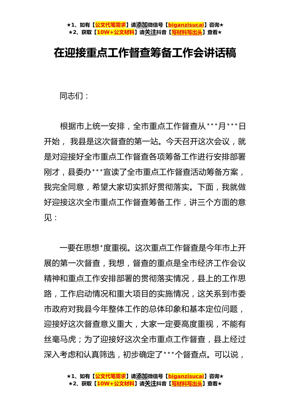 ★1、如有【公文代笔需求】请添加微信号【biganzisucai】咨询★★2、获取【10W+公文材料】请关注抖音【写材料写出头】查看★在迎接重点工作督查筹备工作会讲话稿同志们:根据市上统一安排,全市重点工作督查从***月***日开始,我县是这次督查的第一站。今天召开这次会议,就是对迎接好全市重点工作督查各项筹备工作进行安排部署刚才,县委办***宣读了全市重点工作督查活动筹备方案,我完全同意,希望大家切实抓好贯彻落实。下面,我就做好迎接这次全市重点工作督查筹备工作,讲三个方面的意见:一要在思想*度重视。这次重点工作督查是今年市上开展的第一次督查,我想,督查的重点是全市经济工作会议精神和重点工作安排部署的贯彻落实情况,县上的工作思路,工作启动情况和重大项目的实施情况,这关系到市委市政府...