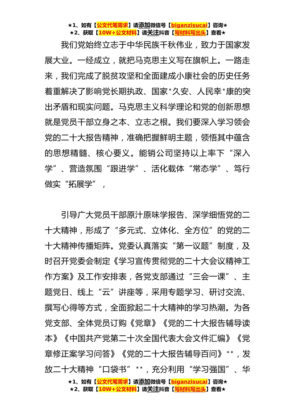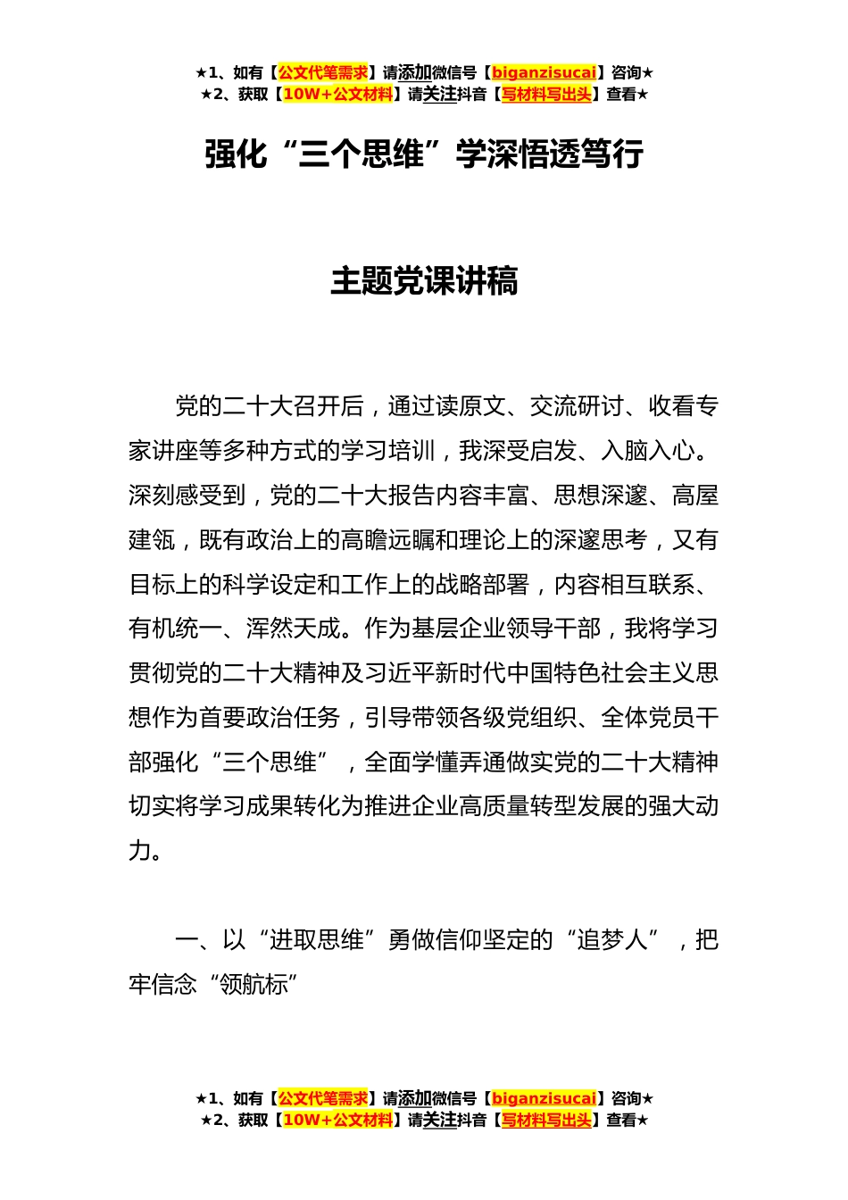 ★1、如有【公文代笔需求】请添加微信号【biganzisucai】咨询★★2、获取【10W+公文材料】请关注抖音【写材料写出头】查看★强化“三个思维”学深悟透笃行主题党课讲稿党的二十大召开后,通过读原文、交流研讨、收看专家讲座等多种方式的学习培训,我深受启发、入脑入心。深刻感受到,党的二十大报告内容丰富、思想深邃、高屋建瓴,既有政治上的高瞻远瞩和理论上的深邃思考,又有目标上的科学设定和工作上的战略部署,内容相互联系、有机统一、浑然天成。作为基层企业领导干部,我将学习贯彻党的二十大精神及习近平新时代中国特色社会主义思想作为首要政治任务,引导带领各级党组织、全体党员干部强化“三个思维”,全面学懂弄通做实党的二十大精神切实将学习成果转化为推进企业高质量转型发展的强大动力。一、以...