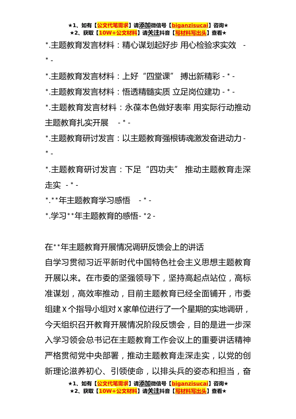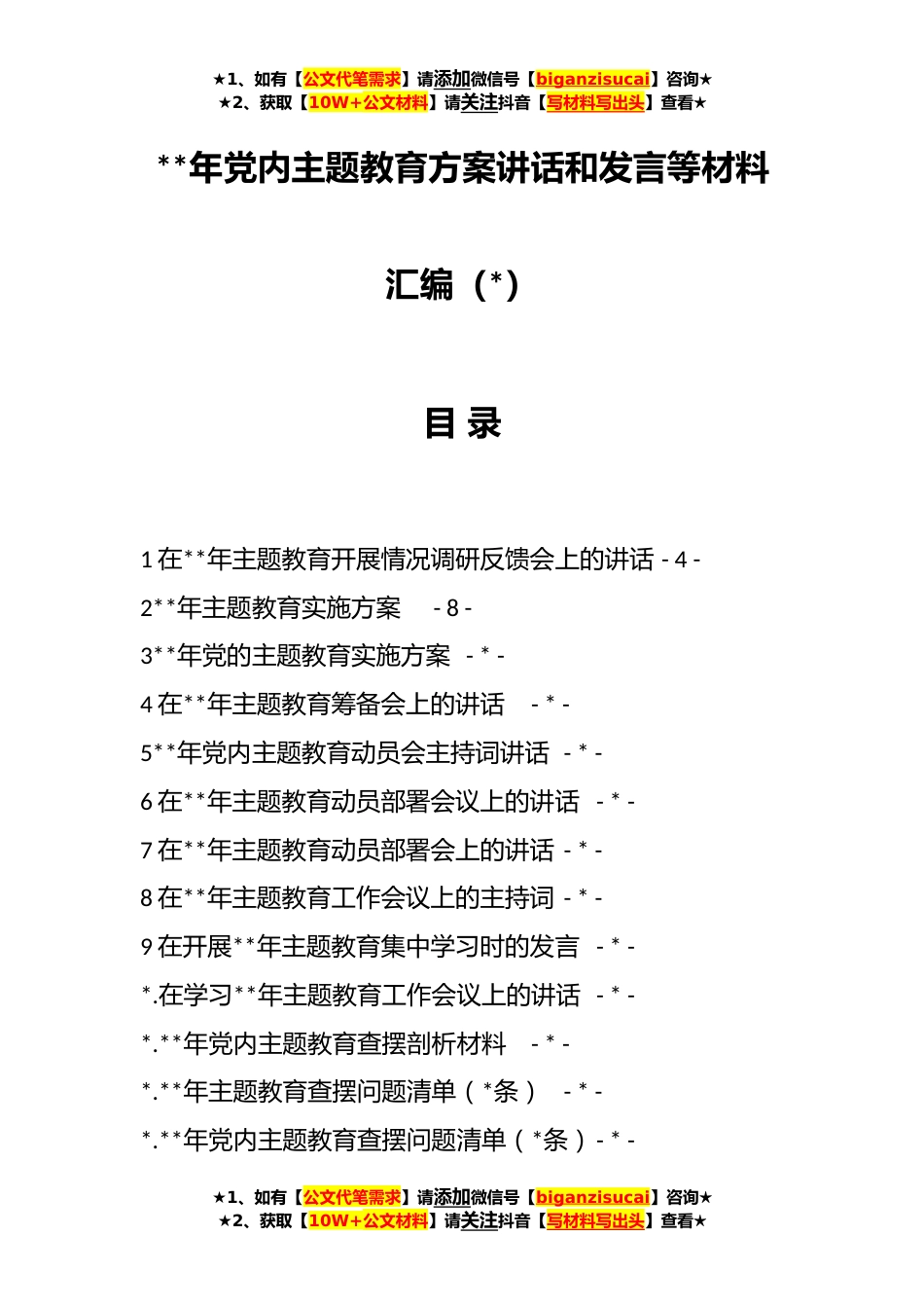 ★1、如有【公文代笔需求】请添加微信号【biganzisucai】咨询★★2、获取【10W+公文材料】请关注抖音【写材料写出头】查看★**年党内主题教育方案讲话和发言等材料汇编(*)目录1在**年主题教育开展情况调研反馈会上的讲话-4-2**年主题教育实施方案-8-3**年党的主题教育实施方案-*-4在**年主题教育筹备会上的讲话-*-5**年党内主题教育动员会主持词讲话-*-6在**年主题教育动员部署会议上的讲话-*-7在**年主题教育动员部署会上的讲话-*-8在**年主题教育工作会议上的主持词-*-9在开展**年主题教育集中学习时的发言-*-*.在学习**年主题教育工作会议上的讲话-*-*.**年党内主题教育查摆剖析材料-*-*.**年主题教育查摆问题清单(*条)-*-*.**年党内主题教育查摆问题清单(*条)-*-★1、如有【公文代笔需求】请添加微信号...