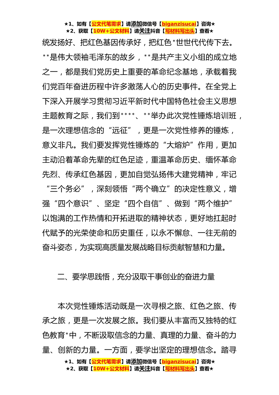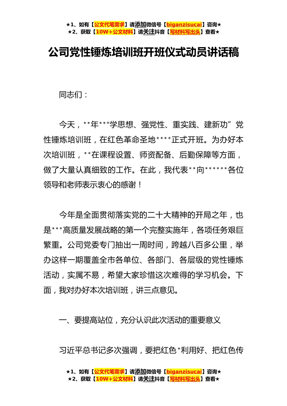 ★1、如有【公文代笔需求】请添加微信号【biganzisucai】咨询★★2、获取【10W+公文材料】请关注抖音【写材料写出头】查看★公司党性锤炼培训班开班仪式动员讲话稿同志们:今天,**年**“学思想、强党性、重实践、建新功”党性锤炼培训班,在红色革命圣地****正式开班。为办好本次培训班,**在课程设置、师资配备、后勤保障等方面,做了大量认真细致的工作。在此,我代表**向******各位领导和老师表示衷心的感谢!今年是全面贯彻落实党的二十大精神的开局之年,也是***高质量发展战略的第一个完整实施年,各项任务艰巨繁重。公司党委专门抽出一周时间,跨越八百多公里,举办这样一期覆盖全市各单位、各部门、各层级的党性锤炼活动,实属不易,希望大家珍惜这次难得的学习机会。下面,我对办好本次培训班,讲三点意...
