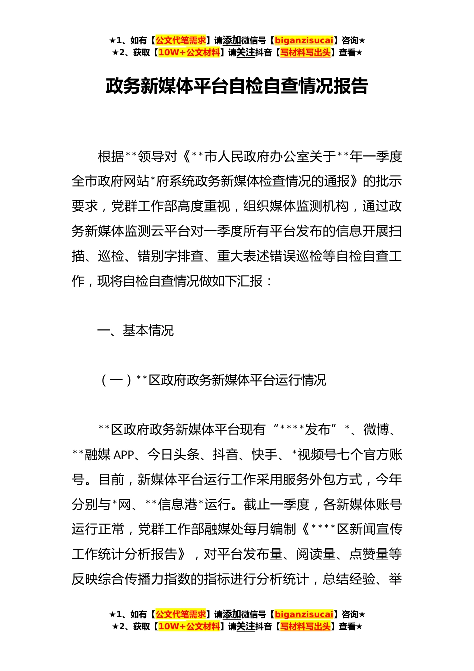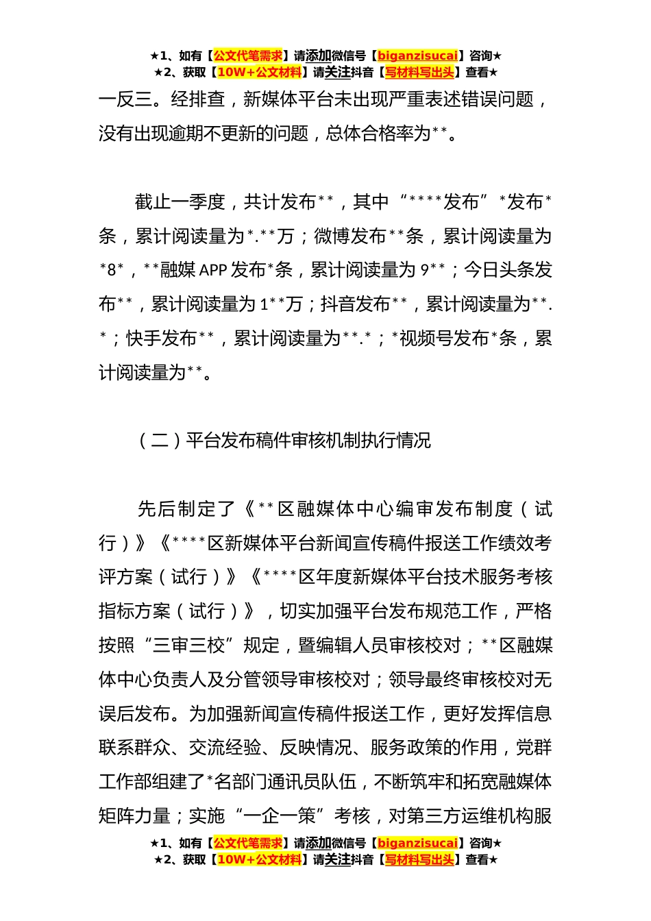 ★1、如有【公文代笔需求】请添加微信号【biganzisucai】咨询★★2、获取【10W+公文材料】请关注抖音【写材料写出头】查看★政务新媒体平台自检自查情况报告根据**领导对《**市人民政府办公室关于**年一季度全市政府网站*府系统政务新媒体检查情况的通报》的批示要求,党群工作部高度重视,组织媒体监测机构,通过政务新媒体监测云平台对一季度所有平台发布的信息开展扫描、巡检、错别字排查、重大表述错误巡检等自检自查工作,现将自检自查情况做如下汇报:一、基本情况(一)**区政府政务新媒体平台运行情况**区政府政务新媒体平台现有“****发布”*、微博、**融媒APP、今日头条、抖音、快手、*视频号七个官方账号。目前,新媒体平台运行工作采用服务外包方式,今年分别与*网、**信息港*运行。截止一季度,各新...